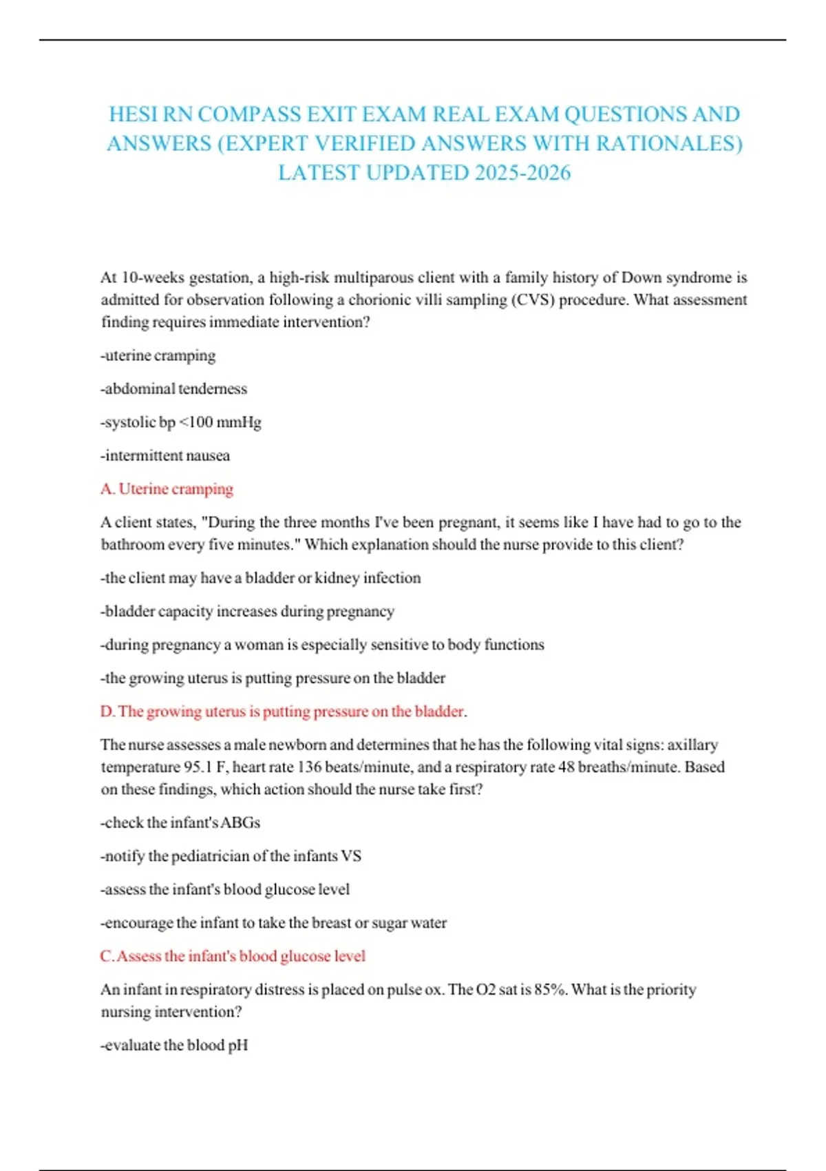 HESI RN COMPASS EXIT EXAM REAL EXAM QUESTIONS AND ANSWERS (EXPERT VERIFIED ANSWERS WITH RATIONALES) LATEST UPDATED