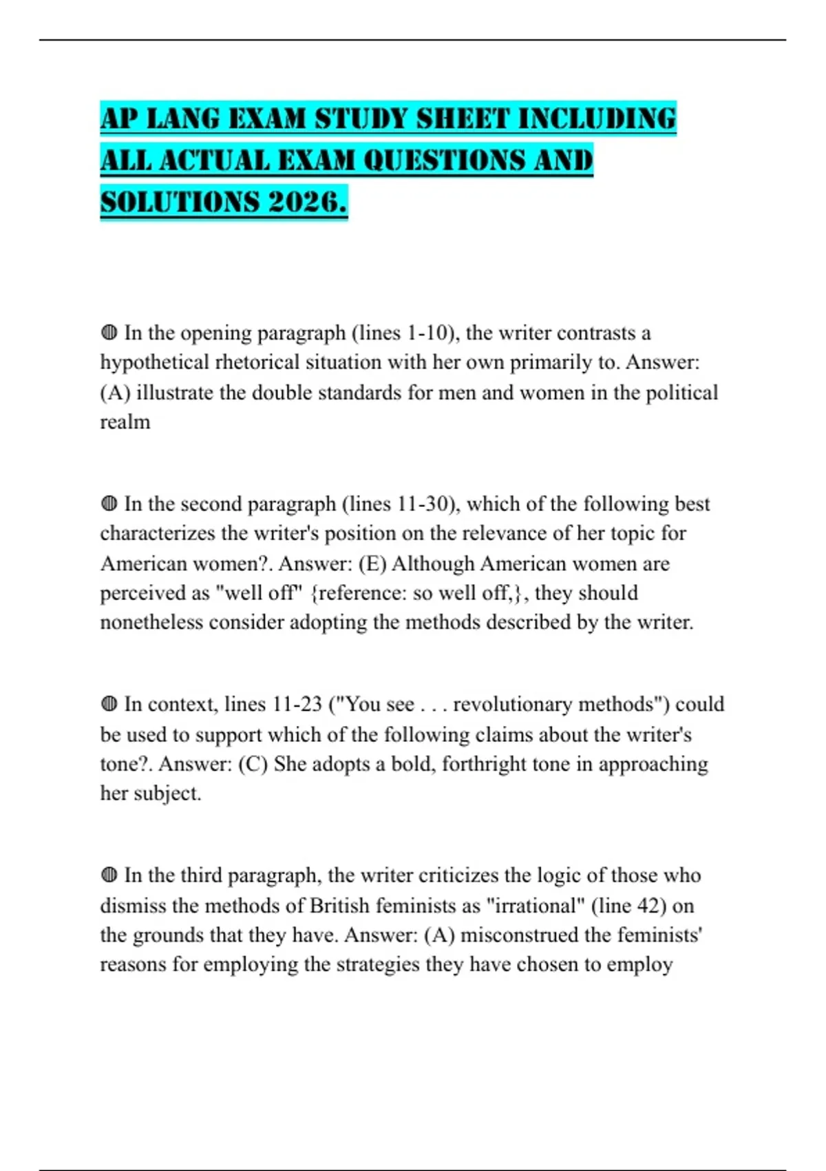 AP LANG EXAM STUDY SHEET INCLUDING ALL ACTUAL EXAM QUESTIONS AND SOLUTIONS 2026