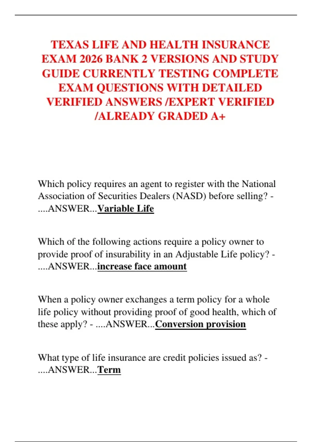TEXAS LIFE AND HEALTH INSURANCE EXAM 2026 BANK 2 VERSIONS AND STUDY GUIDE CURRENTLY TESTING COMPLETE EXAM QUESTIONS WITH DETAILED VERIFIED ANSWERS /EXPERT VERIFIED /ALREADY GRADED A+