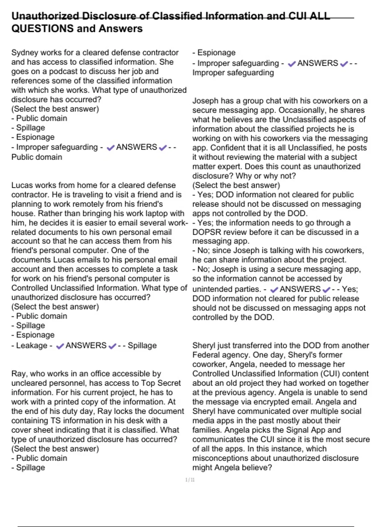 Unauthorized Disclosure of Classified Information and CUI ALL QUESTIONS and Answers