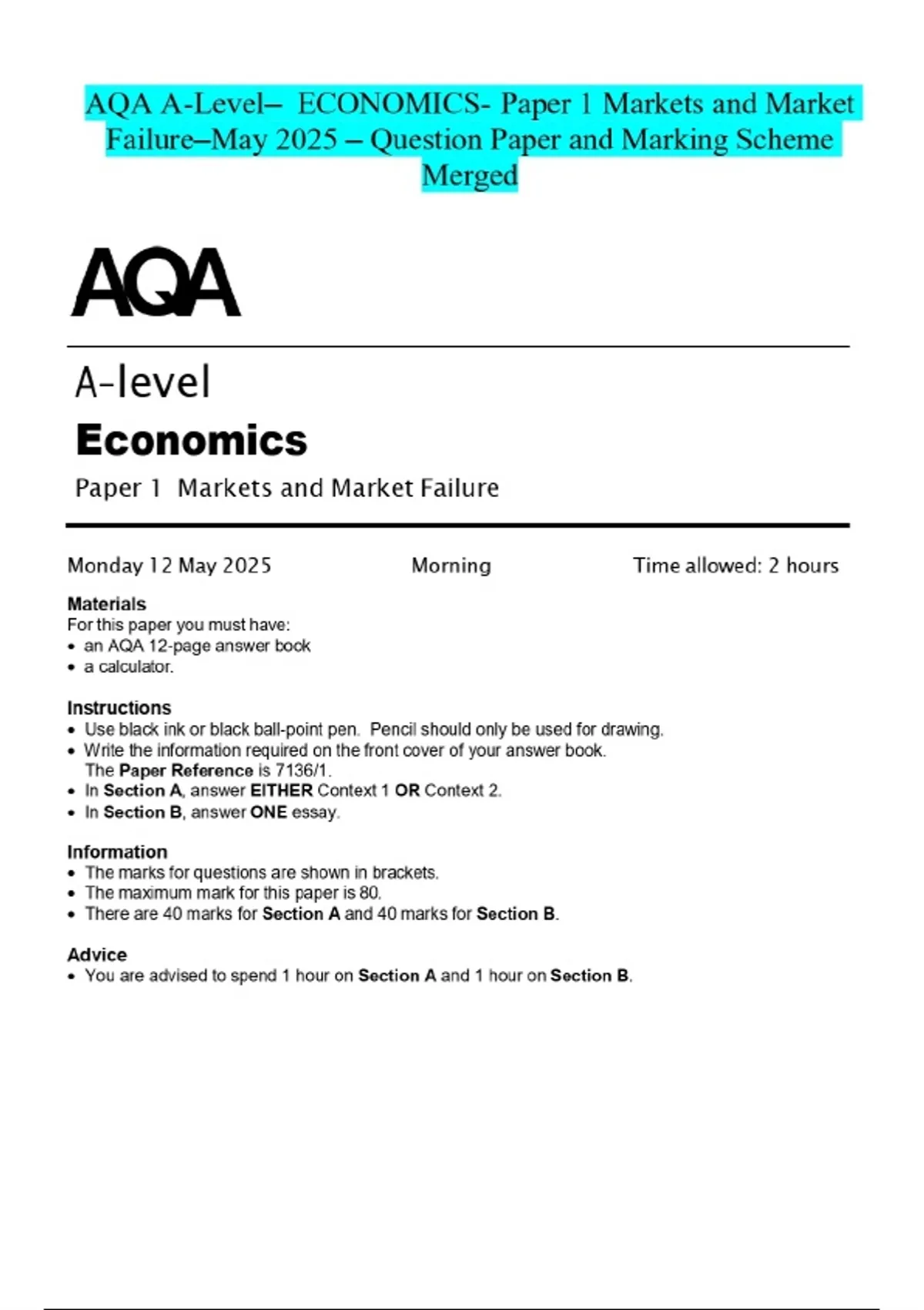 AQA A-Level- ECONOMICS- Paper 1 Markets and Market Failure-May 2025 – Question Paper and Marking Scheme Merged