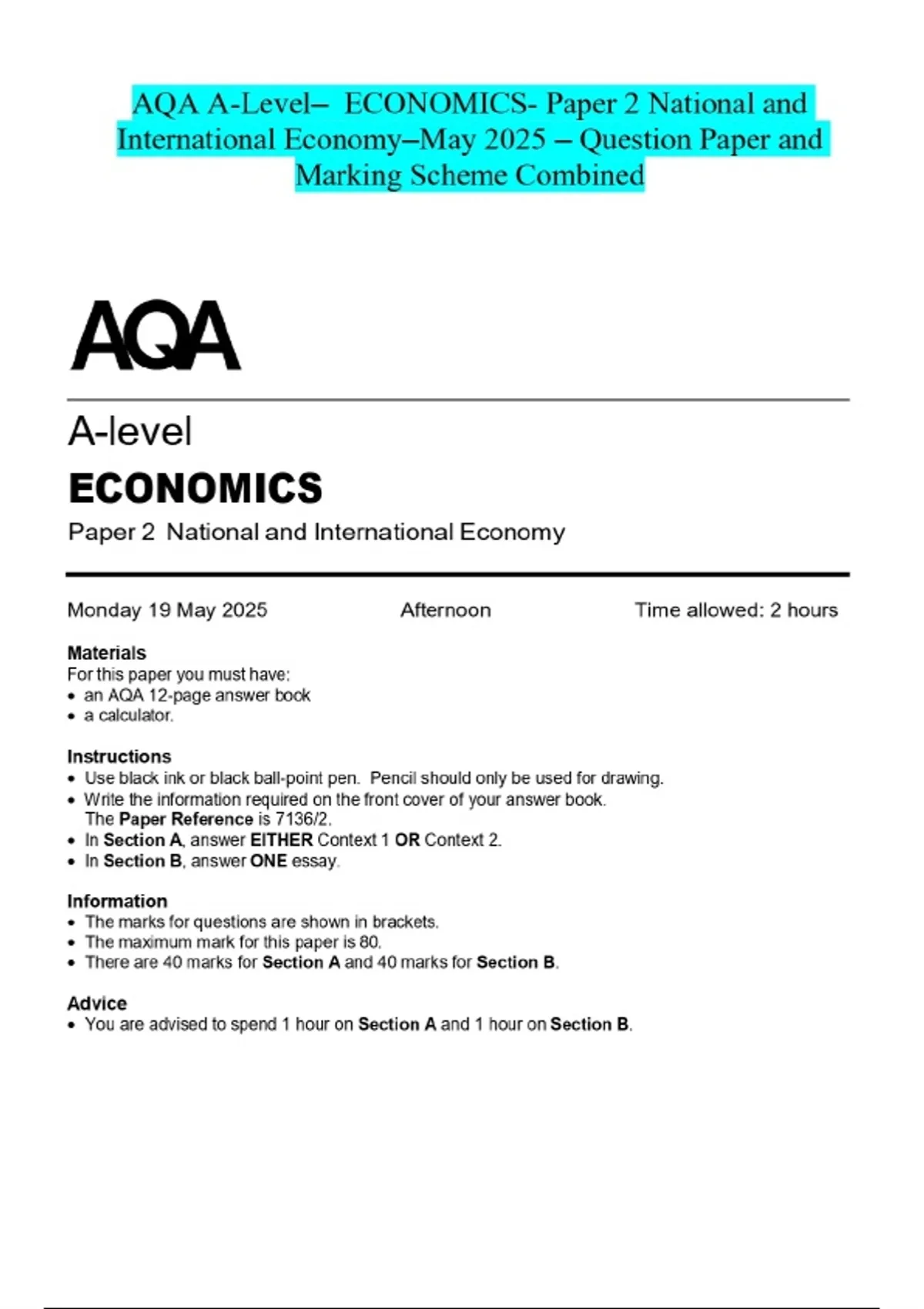 AQA A-Level- ECONOMICS- Paper 2 National and International Economy-May 2025 - Question Paper and Marking Scheme Combined