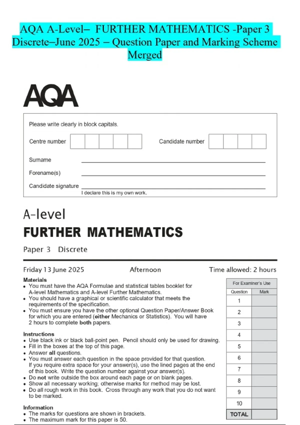 AQA A-Level- FURTHER MATHEMATICS -Paper 3 Discrete-June 2025 - Question Paper and Marking Scheme Merged