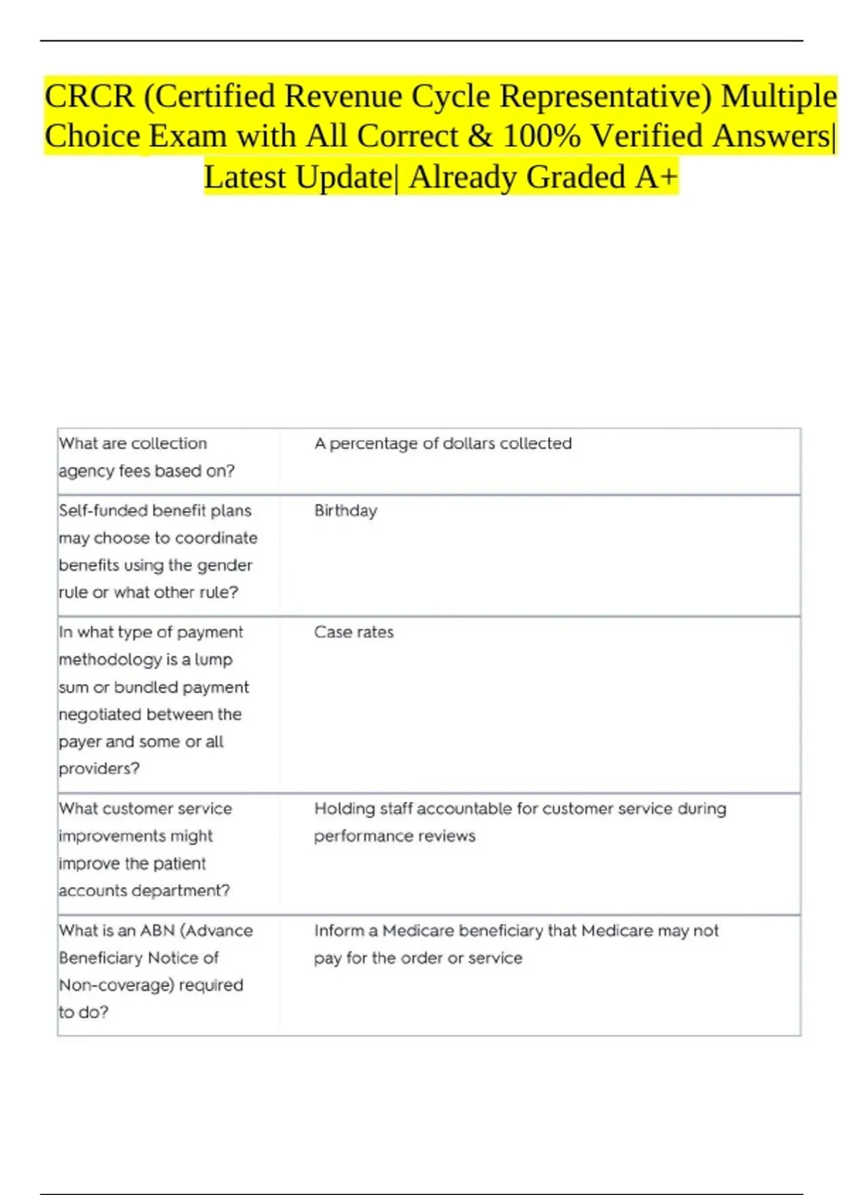 CRCR (Certified Revenue Cycle Representative) Multiple Choice Exam with All Correct & 100% Verified Answers| Latest Update| Already Graded A+