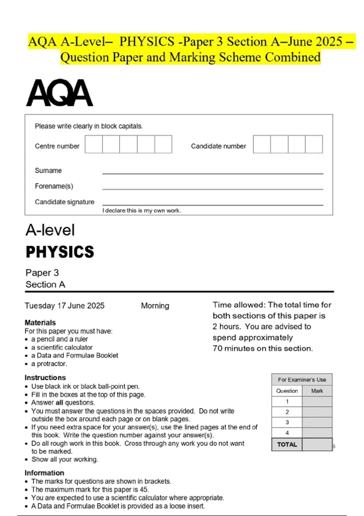 AQA A-Level- PHYSICS -Paper 3 Section A-June 2025- Question Paper and Marking Scheme Combined