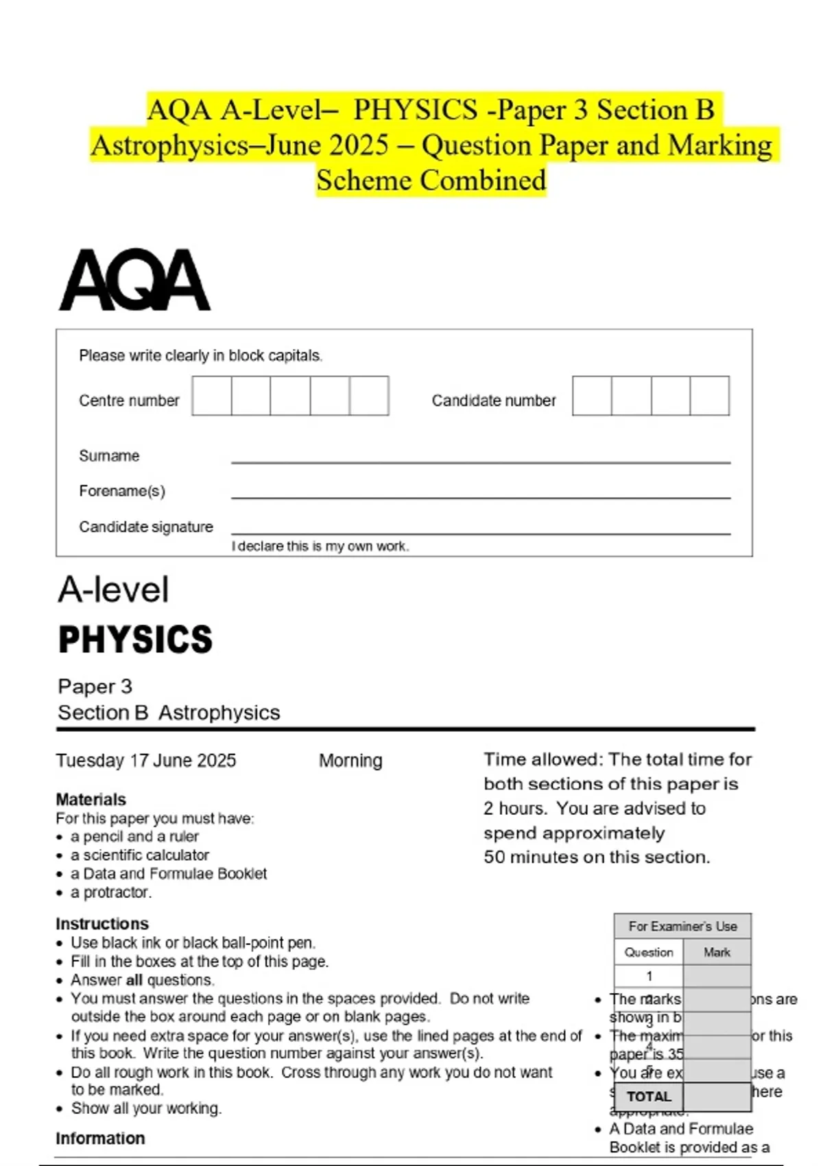 AQA A-Level- PHYSICS -Paper 3 Section B Astrophysics-June 2025 – Question Paper and Marking Scheme Combined