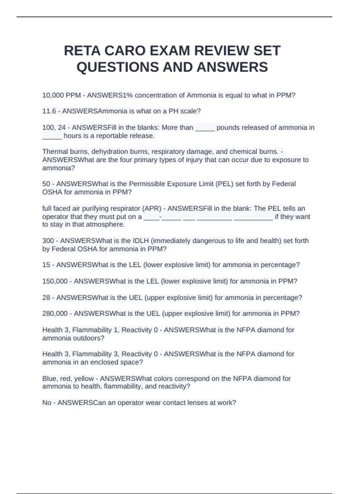 10,000 PPM - ANSWERS1% concentration of Ammonia is equal to what in PPM? 11.6 - ANSWERSAmmonia is what on a PH scale? 100, 24 - ANSWERSFill in the blanks: More than _____ pounds released of ammonia in _____ hours is a reportable release. Thermal burns, dehydration burns, respiratory damage, and chemical burns. - ANSWERSWhat are the four primary types of injury that can occur due to exposure to ammonia? 50 - ANSWERSWhat is the Permissible Exposure Limit (PEL) set forth by Federal OSHA for ammonia in PPM? full faced air purifying respirator (APR) - ANSWERSFill in the blank: The PEL tells an operator that they must put on a ____-_____ ___ _________ __________ if they want to stay in that atmosphere. 300 - ANSWERSWhat is the IDLH (immediately dangerous to life and health) set forth by Federal OSHA for ammonia in PPM? 15 - ANSWERSWhat is the LEL (lower explosive limit) for ammonia in percentage? 150,000 - ANSWERSWhat is the LEL (lower explosive limit) for ammonia in PPM? 28 - ANSWERSWhat is the UEL (upper explosive limit) for ammonia in percentage?