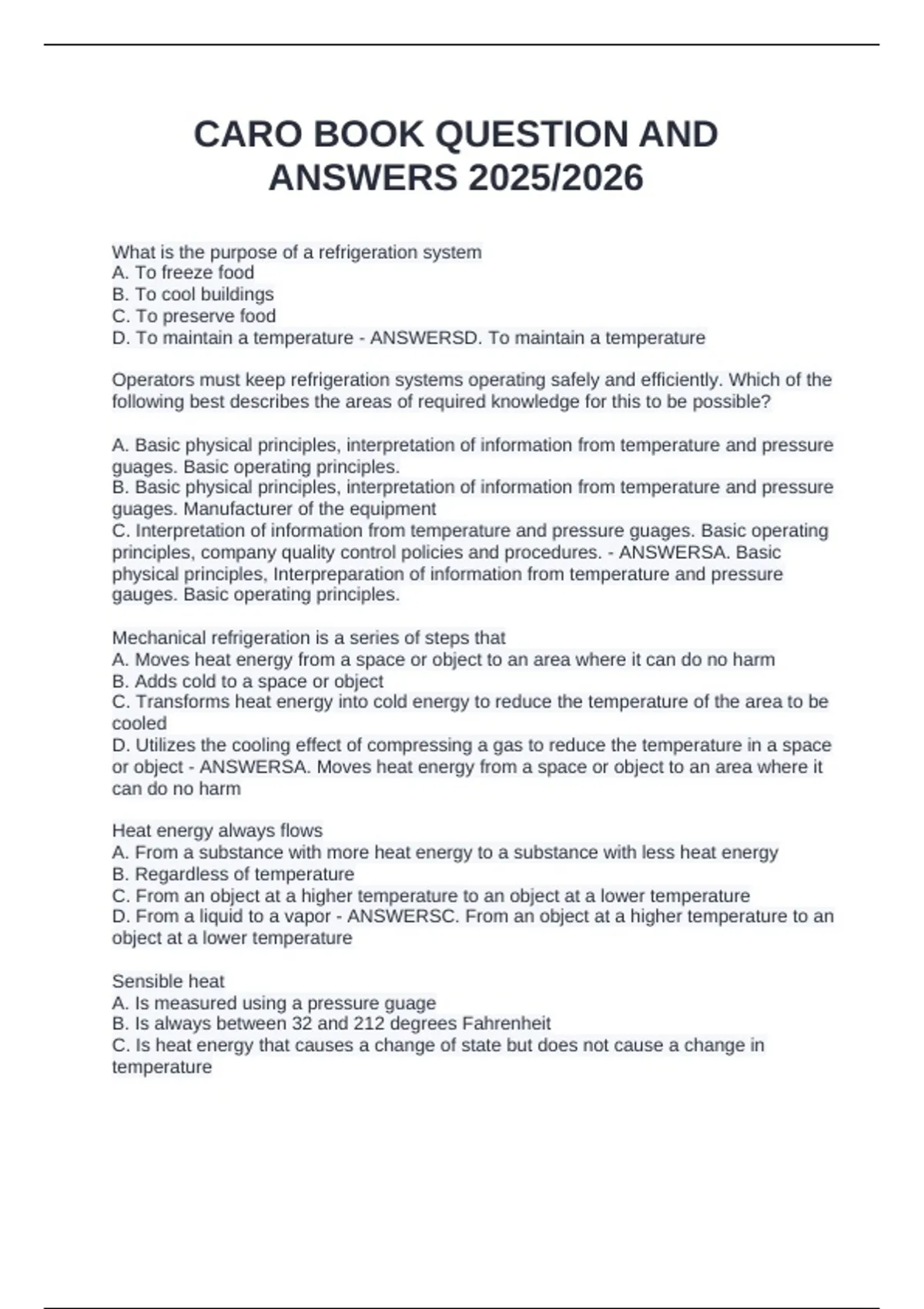 What is the purpose of a refrigeration system A. To freeze food B. To cool buildings C. To preserve food D. To maintain a temperature - ANSWERSD. To maintain a temperature Operators must keep refrigeration systems operating safely and efficiently. Which of the following best describes the areas of required knowledge for this to be possible? A. Basic physical principles, interpretation of information from temperature and pressure guages. Basic operating principles. B. Basic physical principles, interpretation of information from temperature and pressure guages. Manufacturer of the equipment C. Interpretation of information from temperature and pressure guages. Basic operating principles, company quality control policies and procedures. - ANSWERSA. Basic physical principles, Interpreparation of information from temperature and pressure gauges. Basic operating principles. Mechanical refrigeration is a series of steps that A. Moves heat energy from a space or object to an area where it can do no harm B. Adds cold to a space or object C. Transforms heat energy into cold energy to reduce the temperature of the area to be cooled D. Utilizes the cooling effect of compressing a gas to reduce the temperature in a space or object - ANSWERSA. Moves heat energy from a space or object to an area where it can do no harm Heat energy always flows A. From a substance with more heat energy to a substance with less heat energy B. Regardless of temperature C. From an object at a higher temperature to an object at a lower temperature D. From a liquid to a vapor - ANSWERSC. From an object at a higher temperature to an object at a lower temperature Sensible heat A. Is measured using a pressure guage B. Is always between 32 and 212 degrees Fahrenheit C. Is heat energy that causes a change of state but does not cause a change in