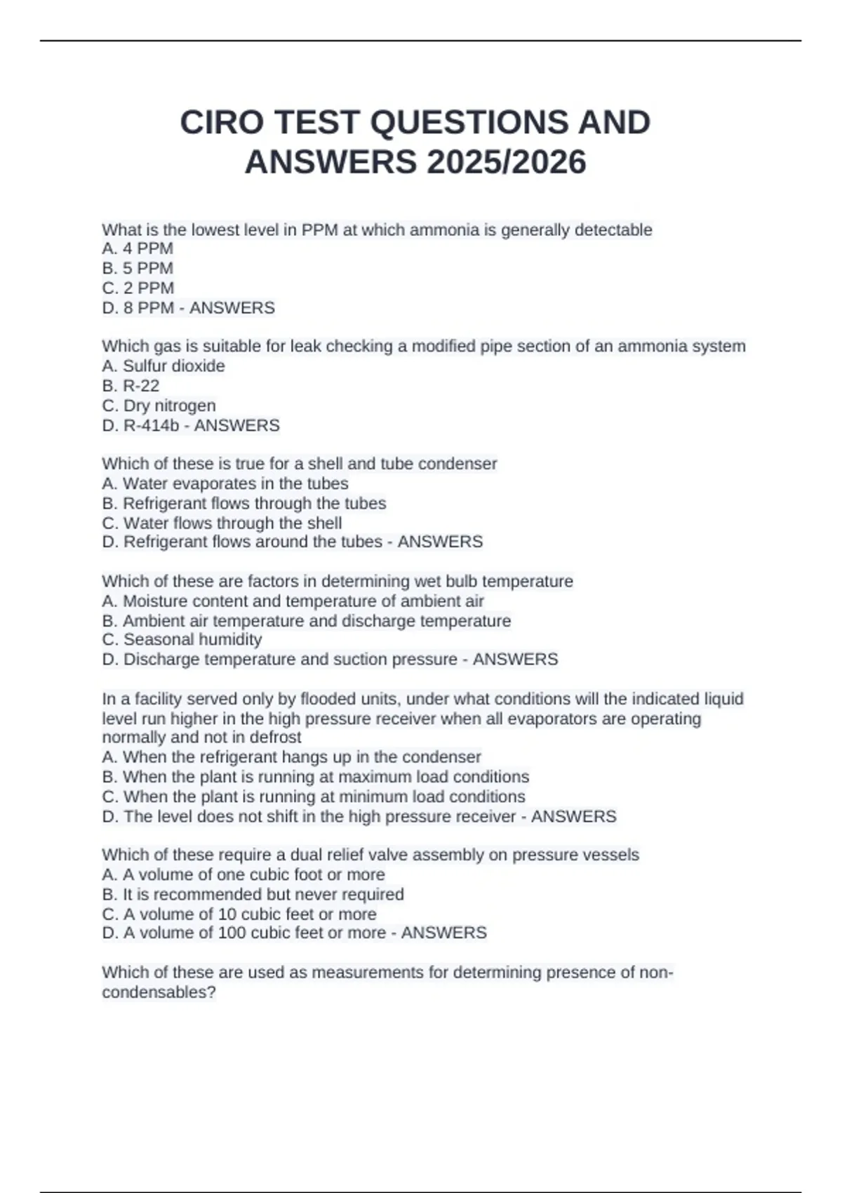 What is the lowest level in PPM at which ammonia is generally detectable A. 4 PPM B. 5 PPM C. 2 PPM D. 8 PPM - ANSWERS Which gas is suitable for leak checking a modified pipe section of an ammonia system A. Sulfur dioxide B. R-22 C. Dry nitrogen D. R-414b - ANSWERS Which of these is true for a shell and tube condenser A. Water evaporates in the tubes B. Refrigerant flows through the tubes C. Water flows through the shell D. Refrigerant flows around the tubes - ANSWERS Which of these are factors in determining wet bulb temperature A. Moisture content and temperature of ambient air B. Ambient air temperature and discharge temperature C. Seasonal humidity D. Discharge temperature and suction pressure - ANSWERS In a facility served only by flooded units, under what conditions will the indicated liquid level run higher in the high pressure receiver when all evaporators are operating normally and not in defrost A. When the refrigerant hangs up in the condenser B. When the plant is running at maximum load conditions C. When the plant is running at minimum load conditions D. The level does not shift in the high pressure receiver - ANSWERS Which of these require a dual relief valve assembly on pressure vessels A. A volume of one cubic foot or more B. It is recommended but never required C. A volume of 10 cubic feet or more D. A volume of 100 cubic feet or more - ANSWERS Which of these are used as measurements for determining presence of non-