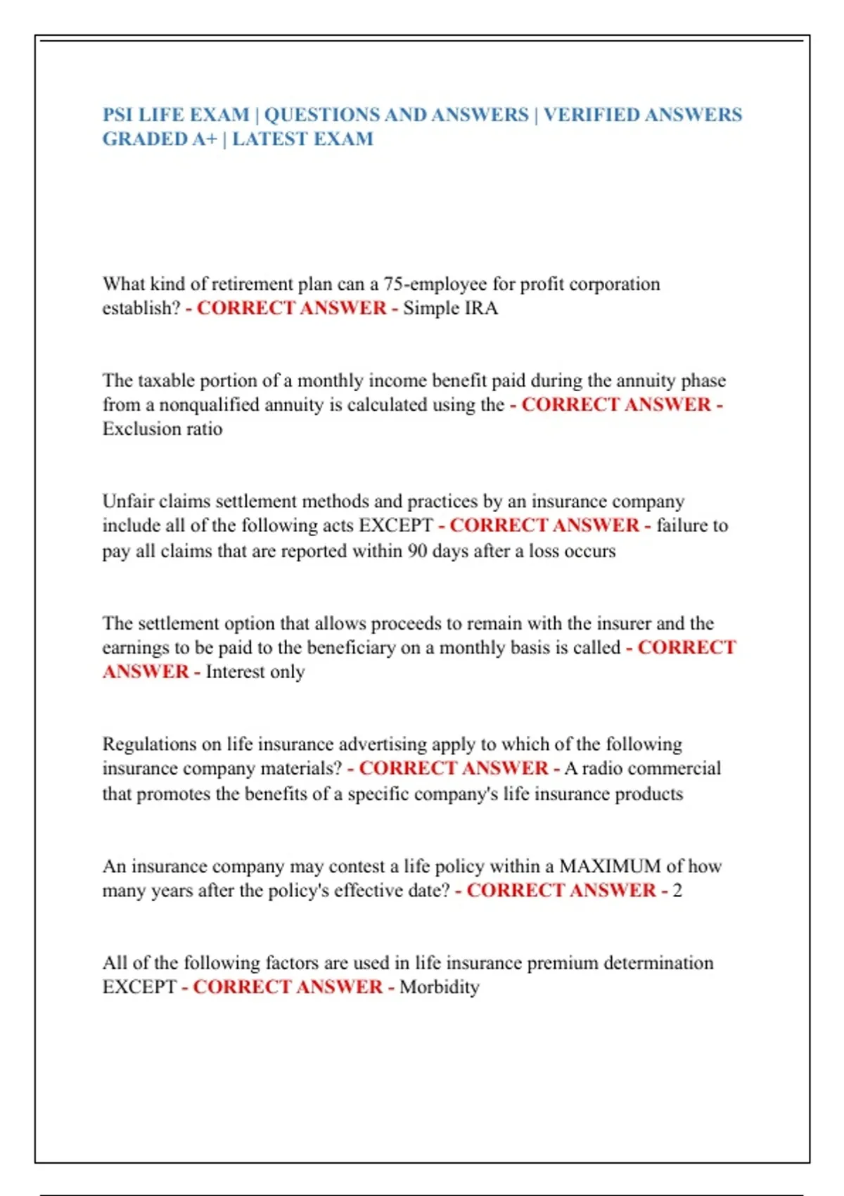 PSI LIFE EXAM | QUESTIONS AND ANSWERS | VERIFIED ANSWERS GRADED A+ | LATEST EXAM