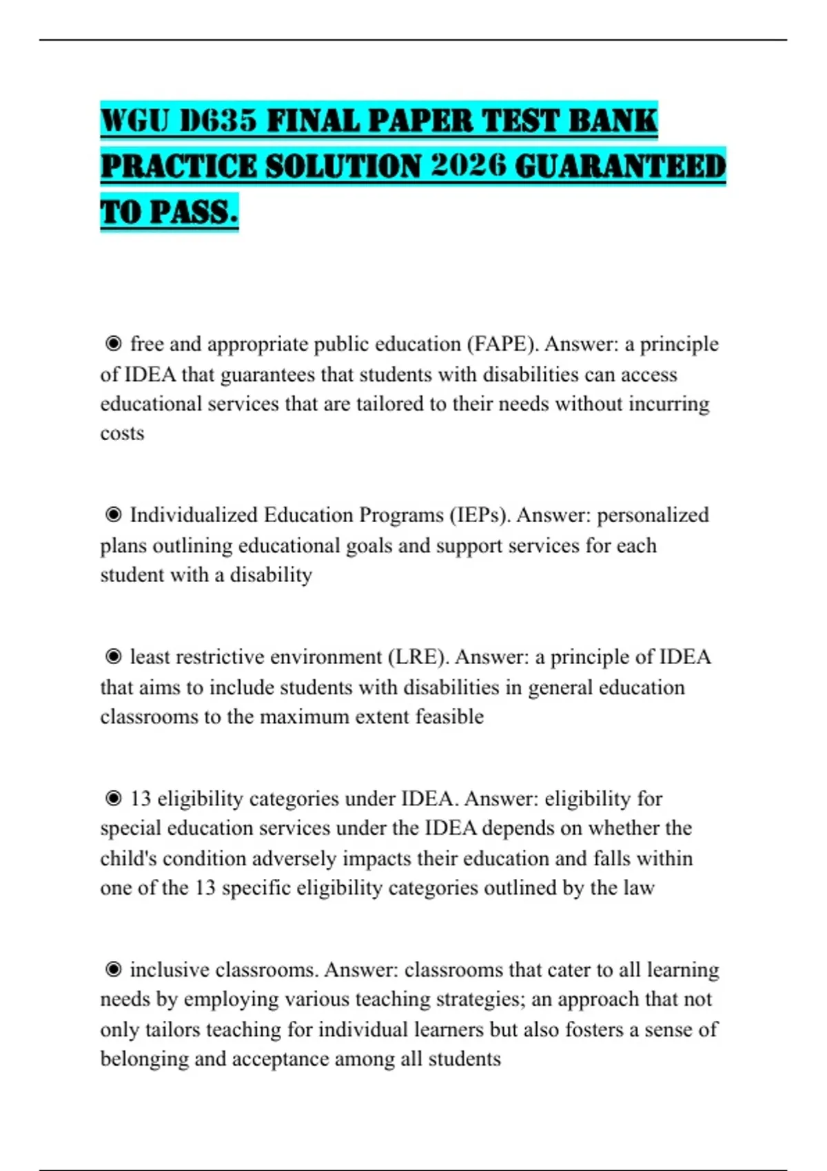 ◉ free and appropriate public education (FAPE). Answer: a principle