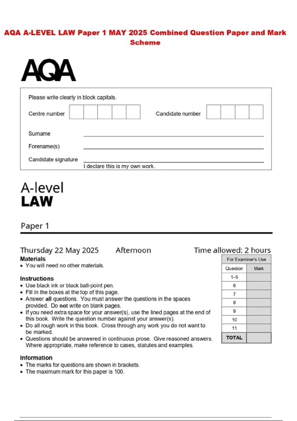 AQA A-LEVEL LAW Paper 1 MAY 2025 Combined Question Paper and Mark Scheme