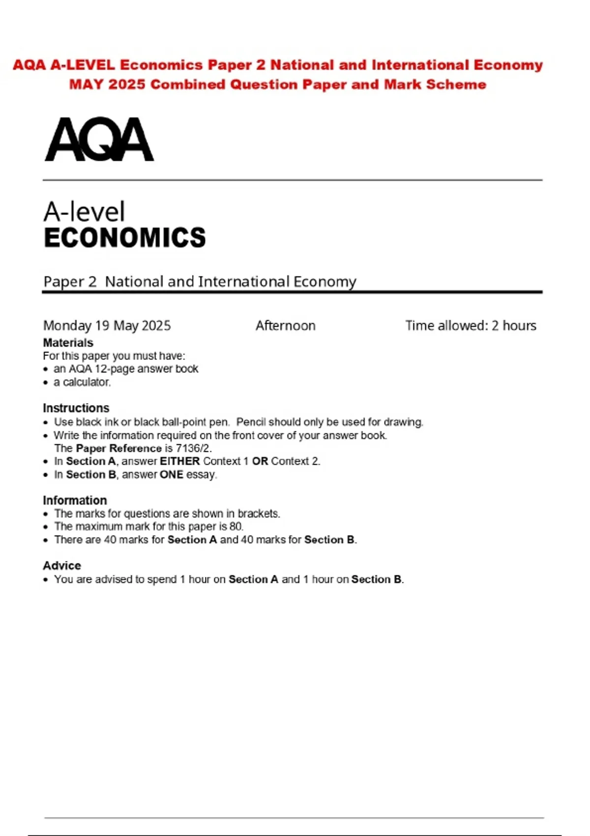 AQA A-LEVEL Economics Paper 2 National and International Economy MAY 2025 Combined Question Paper and Mark Scheme