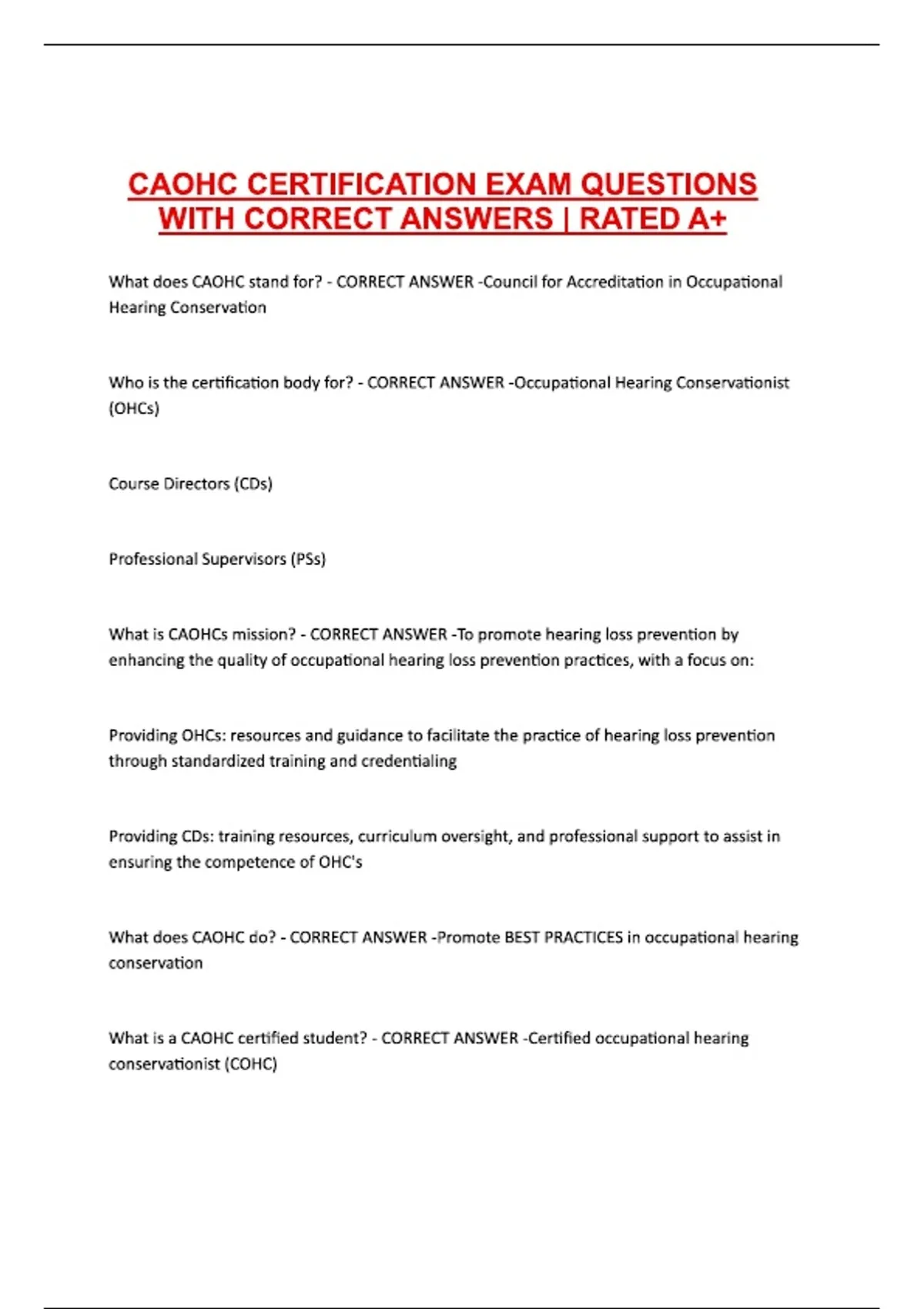 CAOHC CERTIFICATION EXAM QUESTIONS WITH CORRECT ANSWERS RATED A+.