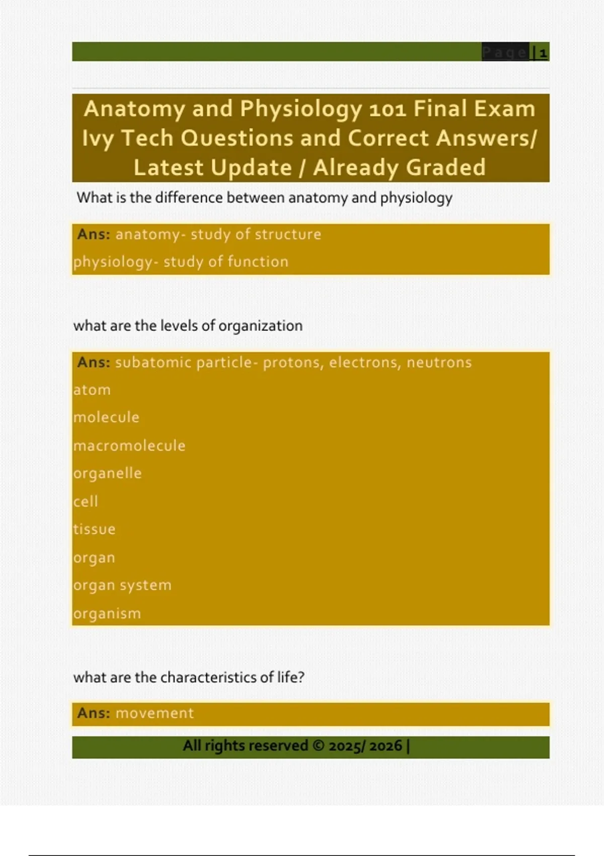 Anatomy and Physiology 101 Final Exam Ivy Tech Questions and Correct Answers/ Latest Update / Already Graded