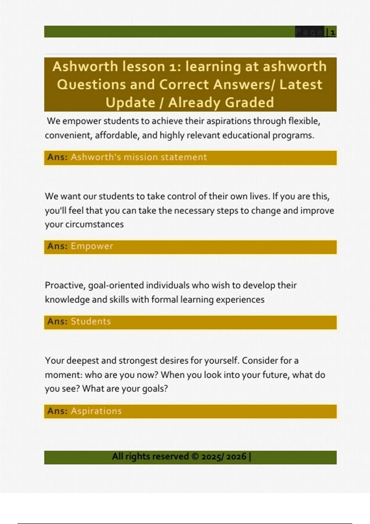 Ashworth lesson 1: learning at ashworth Questions and Correct Answers/ Latest Update / Already Graded