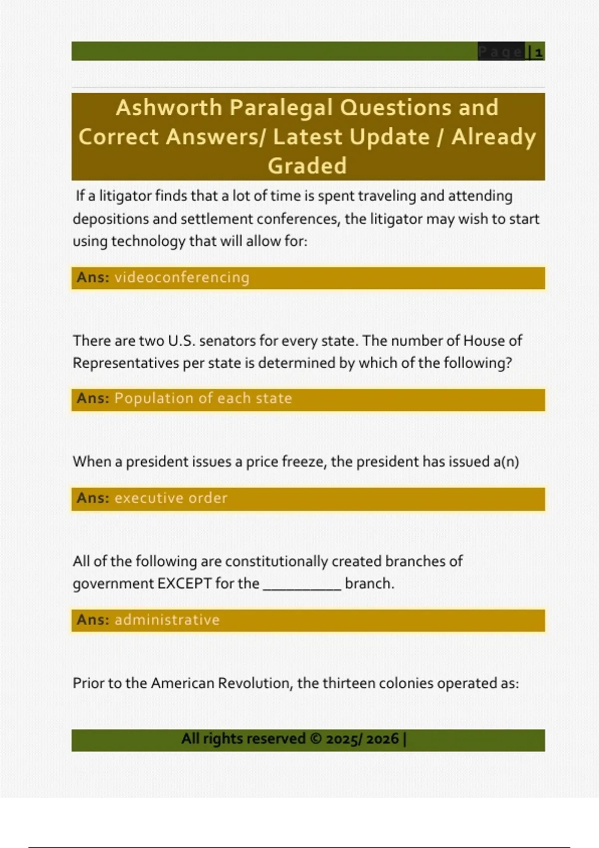 If a litigator finds that a lot of time is spent traveling and attending depositions and settlement conferences, the litigator may wish to start using technology that will allow for: Ans: videoconferencing There are two U.S. senators for every state. The number of House of Representatives per state is determined by which of the following? Ans: Population of each state When a president issues a price freeze, the president has issued a(n) Ans: executive order All of the following are constitutionally created branches of government EXCEPT for the __________ branch. Ans: administrative Prior to the American Revolution, the thirteen colonies operated as: All rights reserved © 2025/ 2026 | Page | 2 Ans: separate sovereignties under the rule of England If a town council passes a law that regulates noise levels, the council members have enacted: Ans: an ordinance Federalism means which of the following? Ans: The U.S. form of government wherein the 50 states and the federal government share powers In performing legal research, a paralegal finds a state statute that conflicts with a federal statute. The paralegal can assume that: Ans: the federal statute will overrule the state statute. The philosophy of law can also be referred to as: Ans: jurisprudence Keeping the peace, shaping moral standards, promoting social justice, and maximizing individual freedoms are: Ans: functions of law All rights reserved © 2025/ 2026 | Page | 3 Skype is an example of which of the following services? Ans: Voice over Internet Protocol If an estate paralegal needs to prepare a calculation and presentation that shows all expenses of a closed estate file, that paralegal should prepare a: Ans: spreadsheet Converting documents to electronic format can be done by: Ans: document scannin