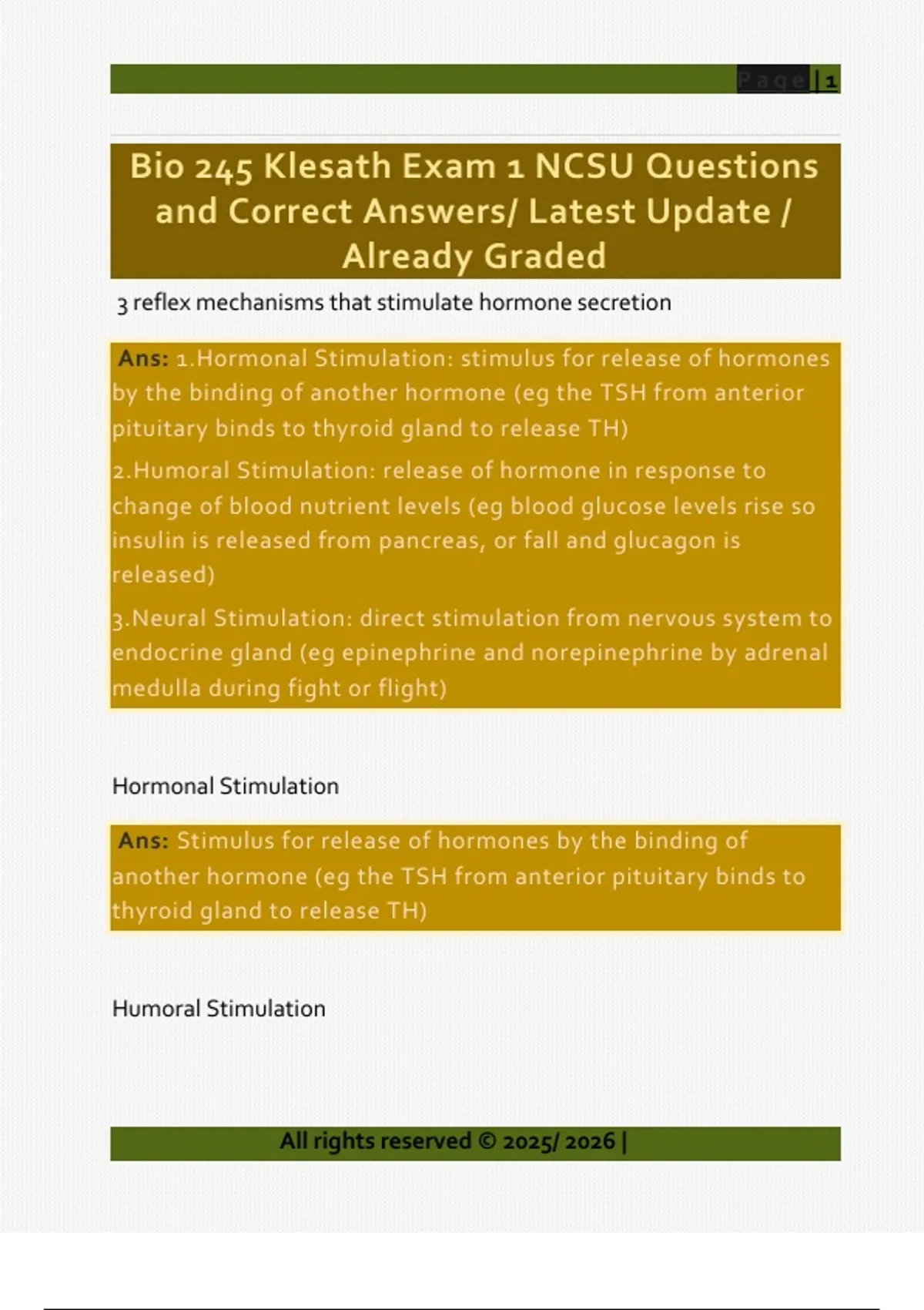 3 reflex mechanisms that stimulate hormone secretion Ans: 1.Hormonal Stimulation: stimulus for release of hormones by the binding of another hormone (eg the TSH from anterior pituitary binds to thyroid gland to release TH) 2.Humoral Stimulation: release of hormone in response to change of blood nutrient levels (eg blood glucose levels rise so insulin is released from pancreas, or fall and glucagon is released) 3.Neural Stimulation: direct stimulation from nervous system to endocrine gland (eg epinephrine and norepinephrine by adrenal medulla during fight or flight) Hormonal Stimulation Ans: Stimulus for release of hormones by the binding of another hormone (eg the TSH from anterior pituitary binds to thyroid gland to release TH) Humoral Stimulation Page | 2 All rights reserved © 2025/ 2026 | Ans: release of hormone in response to change of blood nutrient levels (eg blood glucose levels rise so insulin is released from pancreas, or fall and glucagon is released) Neural Stimulation Ans: direct stimulation from nervous system to endocrine gland (eg epinephrine and norepinephrine by adrenal medulla during fight or flight) Steroids Ans: lipid soluble molecules synthesized by cholesterol 1. Gonads (Estrogen, Progesterone, Testosterone) 2. Adrenal Cortex hormones (Corticosteroids like cortisol, mineralocorticoids, aldosterone) Biogenic Amines Ans: modified amino acids, water soluble (except thyroid) 1. Catecholamines (epinephrine and norepinephrine) 2. Thyroid Hormone → lipid soluble 3. Melatonin Proteins Page | 3 All rights reserved © 2025/ 2026 | Ans: most hormones, sm