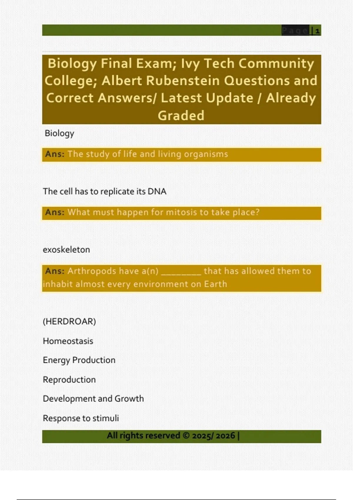 Biology Final Exam; Ivy Tech Community College; Albert Rubenstein Questions and Correct Answers/ Latest Update / Already Graded
