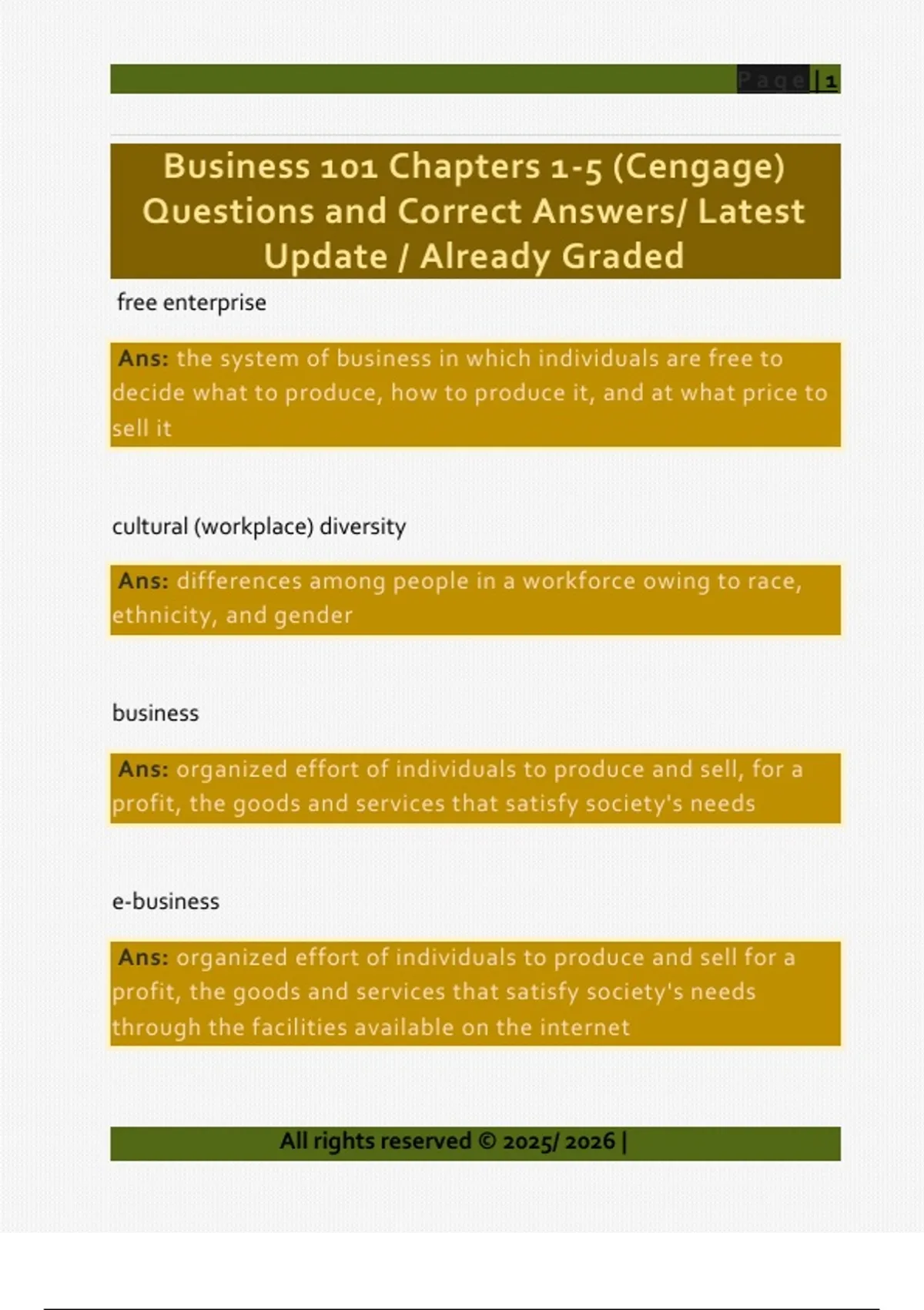 Business 101 Chapters 1-5 (Cengage) Questions and Correct Answers/ Latest Update / Already Graded