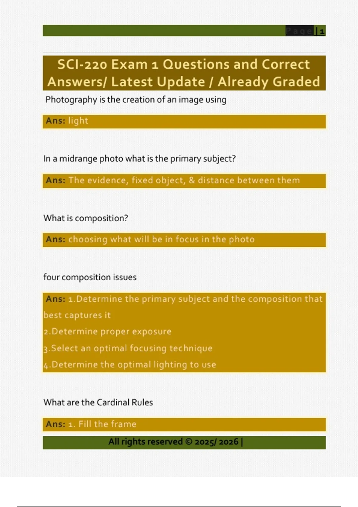 Photography is the creation of an image using Ans: light In a midrange photo what is the primary subject? Ans: The evidence, fixed object, & distance between them What is composition? Ans: choosing what will be in focus in the photo four composition issues Ans: 1.Determine the primary subject and the composition that best captures it 2.Determine proper exposure 3.Select an optimal focusing technique 4.Determine the optimal lighting to use What are the Cardinal Rules Ans: 1. Fill the frame Page | 2 All rights reserved © 2025/ 2026 | 2. Maximize depth of field 3. Keep the film plane parallel A soft shadow allows Ans: you to see the detail within the shadow What is Lens Flare? Ans: Sunlight directly enters the lens and creates images on the lens' optical elements & aperture opening What does a Macro Lens do Ans: •Take photographs with the lens closer to the object than with other lenses •Makes small objects much larger •Decreases the focal distance as compared to other lenses PIXEL IMPORTANCE Ans: More pixels on the image means better resolution when Page | 3 All rights reserved © 2025/ 2026 | enlarged