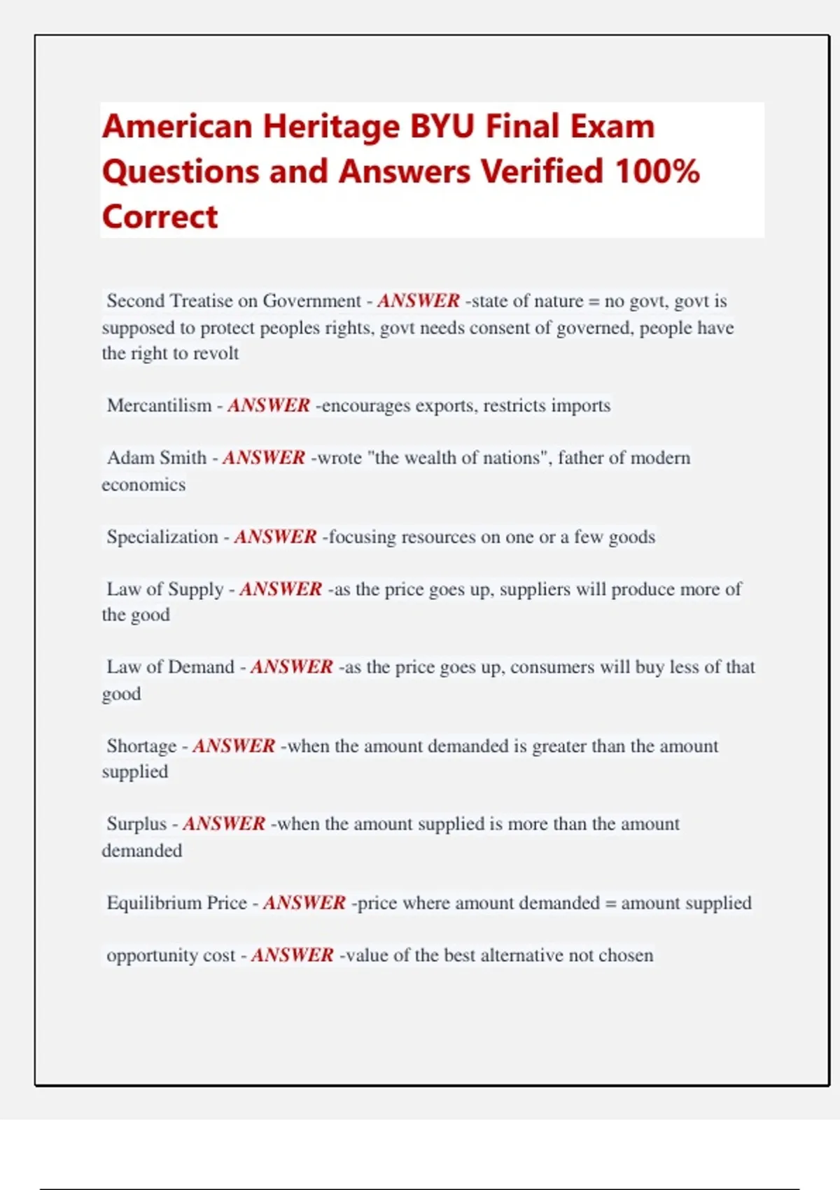 American Heritage BYU Final Exam Questions and Answers Verified 100% Correct Second Treatise on Government - ANSWER -state of nature = no govt, govt is supposed to protect peoples rights, govt needs consent of governed, people have the right to revolt Mercantilism - ANSWER -encourages exports, restricts imports Adam Smith - ANSWER -wrote "the wealth of nations", father of modern economics Specialization - ANSWER -focusing resources on one or a few goods Law of Supply - ANSWER -as the price goes up, suppliers will produce more of the good Law of Demand - ANSWER -as the price goes up, consumers will buy less of that good Shortage - ANSWER -when the amount demanded is greater than the amount supplied Surplus - ANSWER -when the amount supplied is more than the amount demanded Equilibrium Price - ANSWER -price where amount demanded = amount supplied opportunity cost - ANSWER -value of the best alternative not chosen Law of Comparative Advantage - ANSWER -It is more beneficial for producers to make one thing and trade for other things than make everything role of profits - ANSWER -profits increase, number of producers increase role of govt in a market - ANSWER -encourage exchange and ordinary workings Sandel "Jumping the Queue" - ANSWER -moral limits for market reasoning Brennan and Jaworski - ANSWER -Disagree with Sandel Danielle Allen Declaration of Independence - ANSWER -equal and same are different Thomas Paine "American Crisis" - ANSWER -in favor of rev war, inspired many to keep fighting Articles of Confederation - ANSWER -US' first government, failed because it was too weak Four parts of Declaration of Independence - ANSWER -Opening, Theoretical Core, Evidence, Conclusion Human rights - ANSWER -Life, liberty and happiness Government's job - ANSWER -secure people's rights, needs consent Core of D.o.I. - ANSWER -Lockean Liberalism Patrick Henry quote - ANSWER -fight for our rights, liberty or death The American Cincinnatus - ANSWER -George Washington Shays' Rebellion reaction - Jefferson - ANSWER -a little rebellion is a good thing States problems - Madison - ANSWER -Multiplicity, Mutability, Injustice, impotence Collective Action problems - ANSWER -put their own needs first, made things worse for everyone else, cannot solve problems Madison's solution for states - ANSWER -stronger national government Key issues of Convention - ANSWER -representation, federalism, executive, slavery Virginia Plan - ANSWER -favors populous states, Edmund Randolph New Jersey Plan - ANSWER -favors small states, William Paterson, similar to AoC The Great Compromise - ANSWER -bicameral legislature made up of the House and the Senate House of Representatives - ANSWER -rep by population, elected every 2 years Senate - ANSWER -equal rep (2 per state), every 6 years Federalism - ANSWER -divide power between state and federal govt Brutus, montesque on the problem of size - ANSWER -A large republic cannot work Federalist #10 - ANSWER -factions, competition of factions will actually help maintain a healthy republic, less tyranny Federalist #51 - ANSWER -separation of power, control through the nature of the republic, structure of the government, mix responsibilities, Separation of powers - ANSWER -executive: rule enforcement