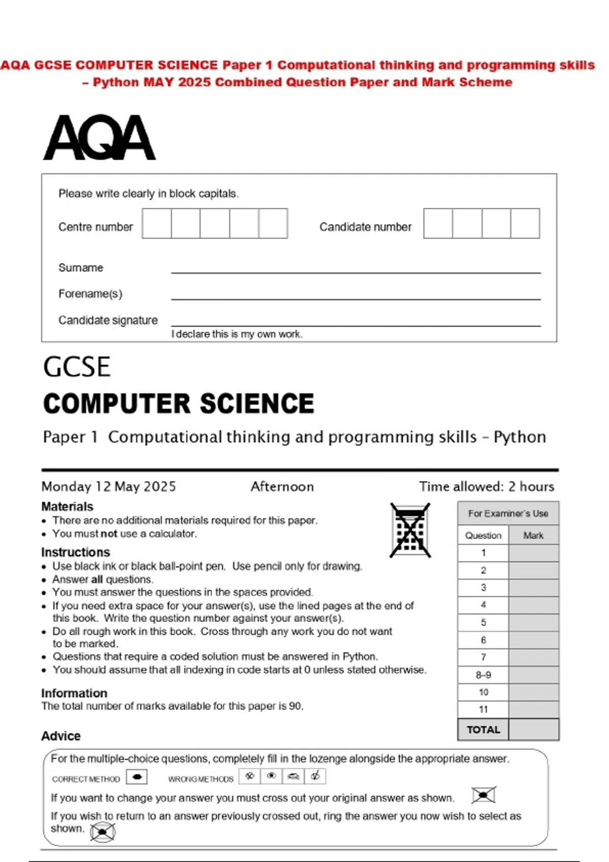 AQA GCSE COMPUTER SCIENCE Paper 1 Computational thinking and programming skills – Python MAY 2025 Combined Question Paper and Mark Scheme