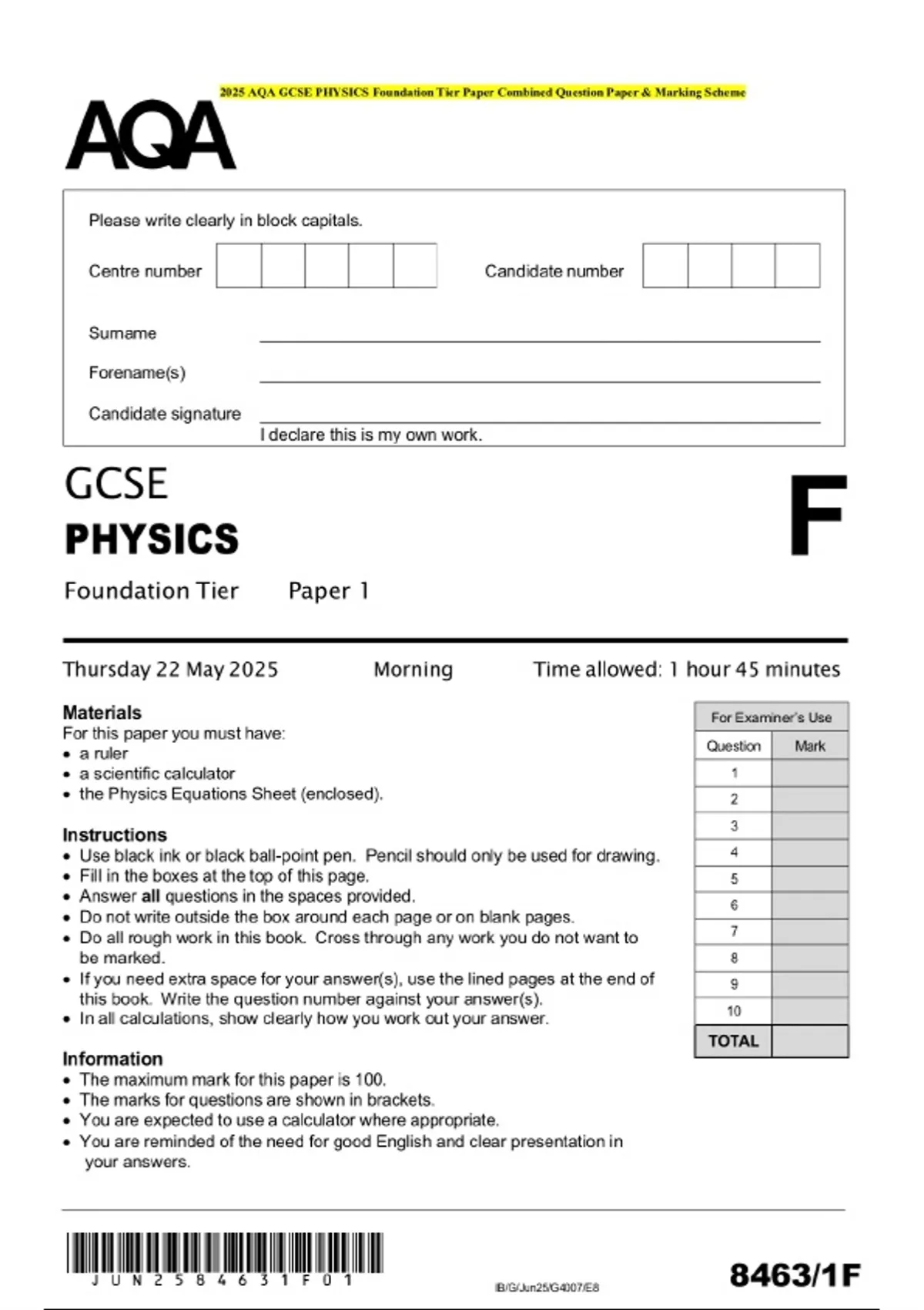 2025 aqa gcse physics foundation tier paper combin