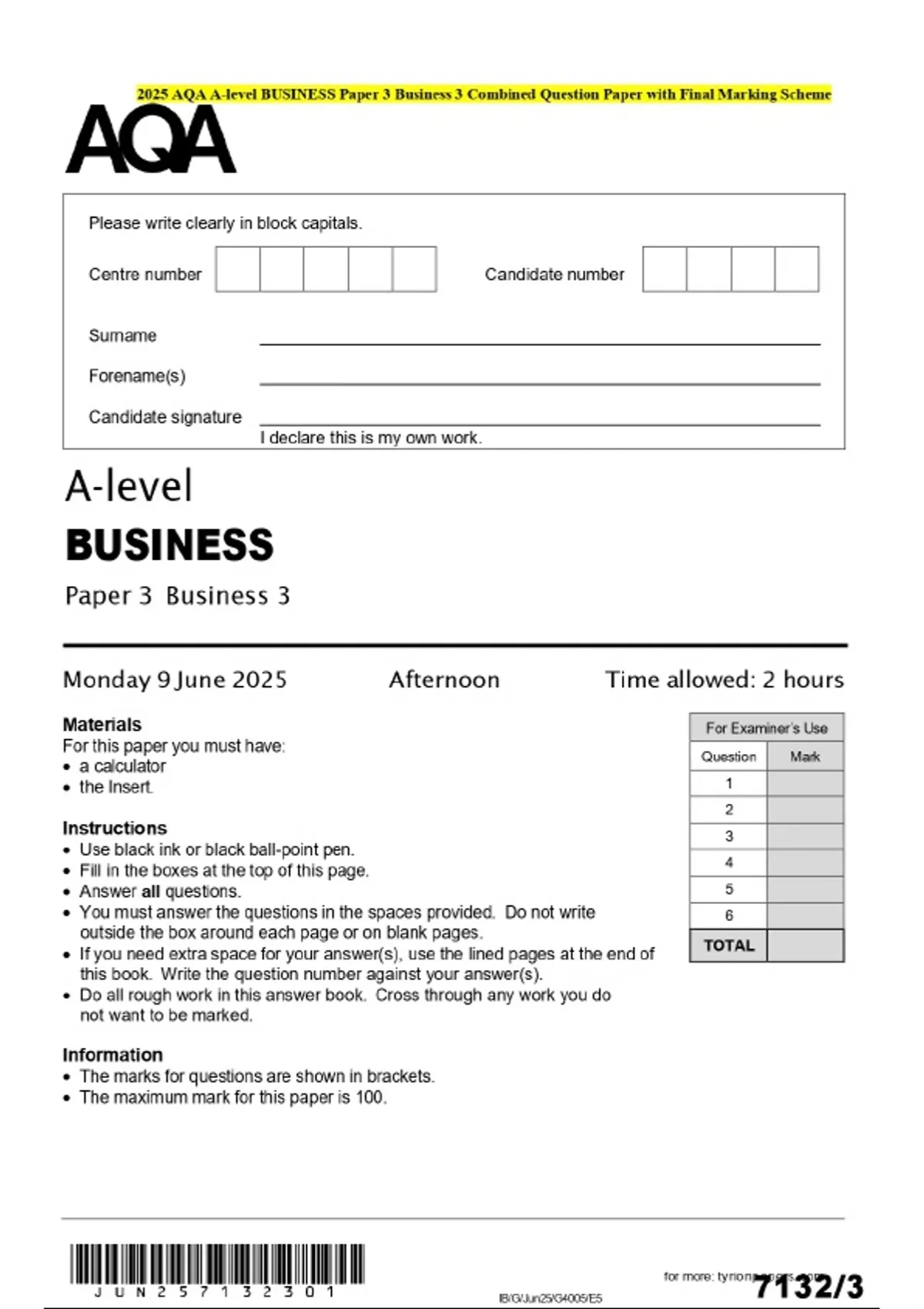 2025 AQA A-level BUSINESS Paper 3 Business 3 Combined Question Paper with Final Marking Scheme