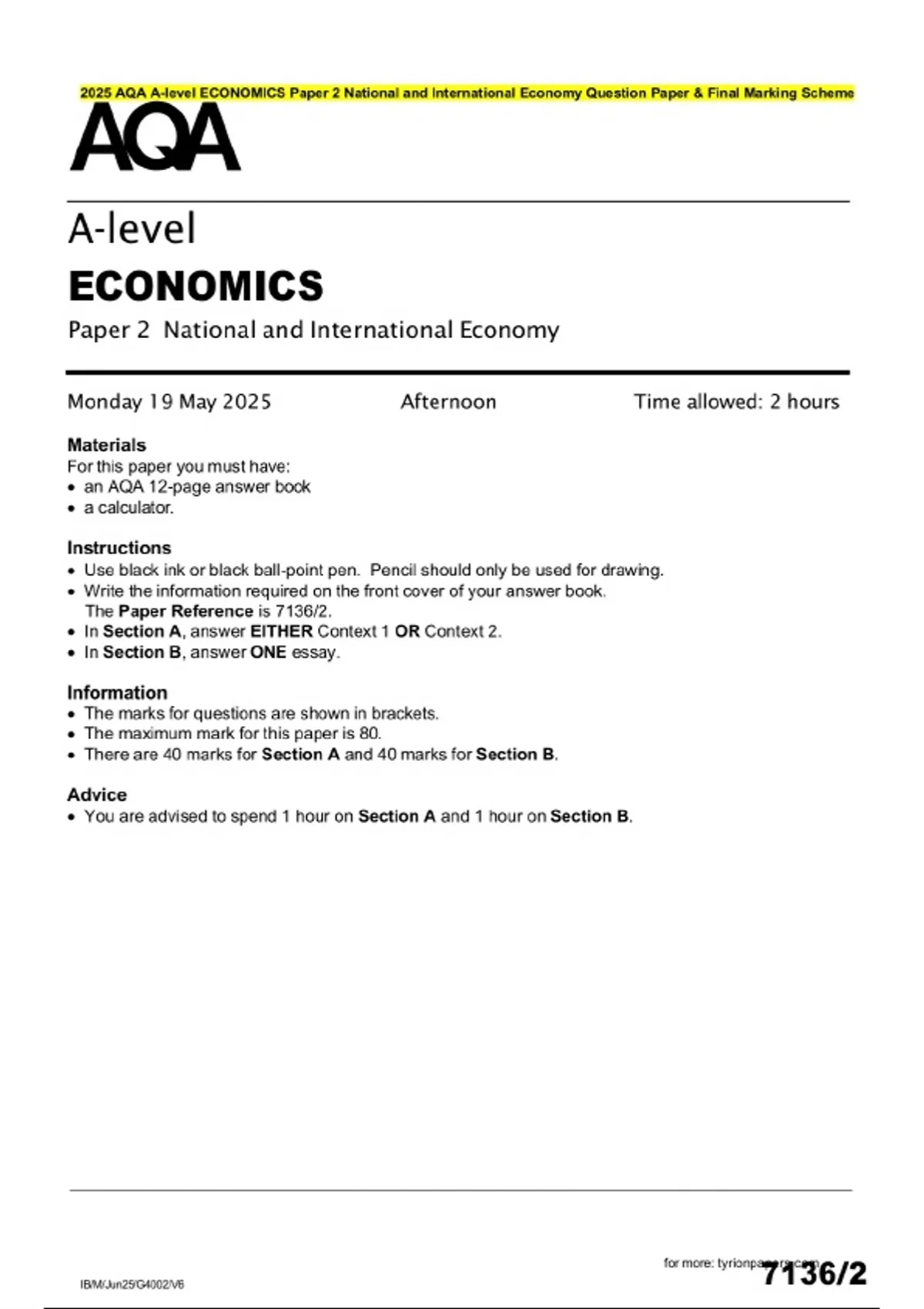 2025 AQA A-level ECONOMICS Paper 2 National and International Economy Question Paper & Final Marking Scheme