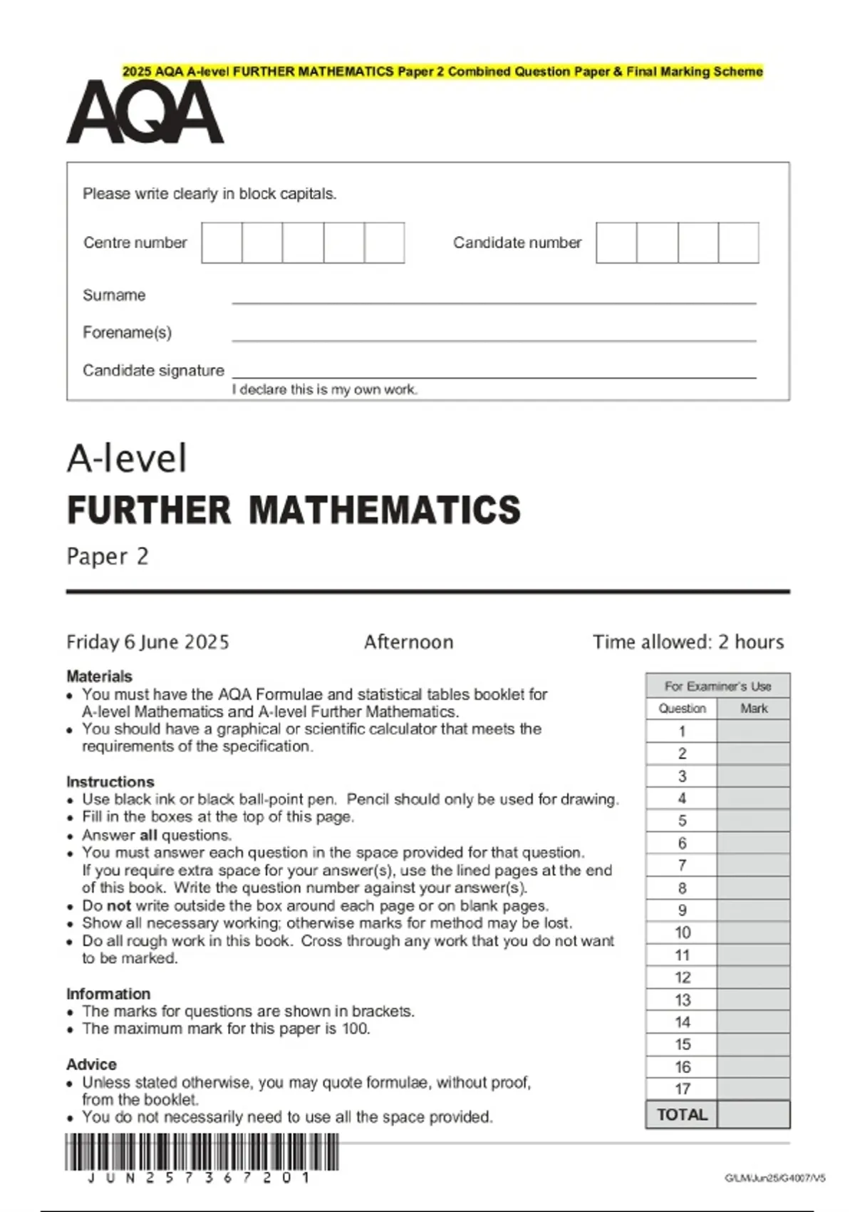 2025 AQA A-level FURTHER MATHEMATICS Paper 2 Combined Question Paper & Final Marking Scheme