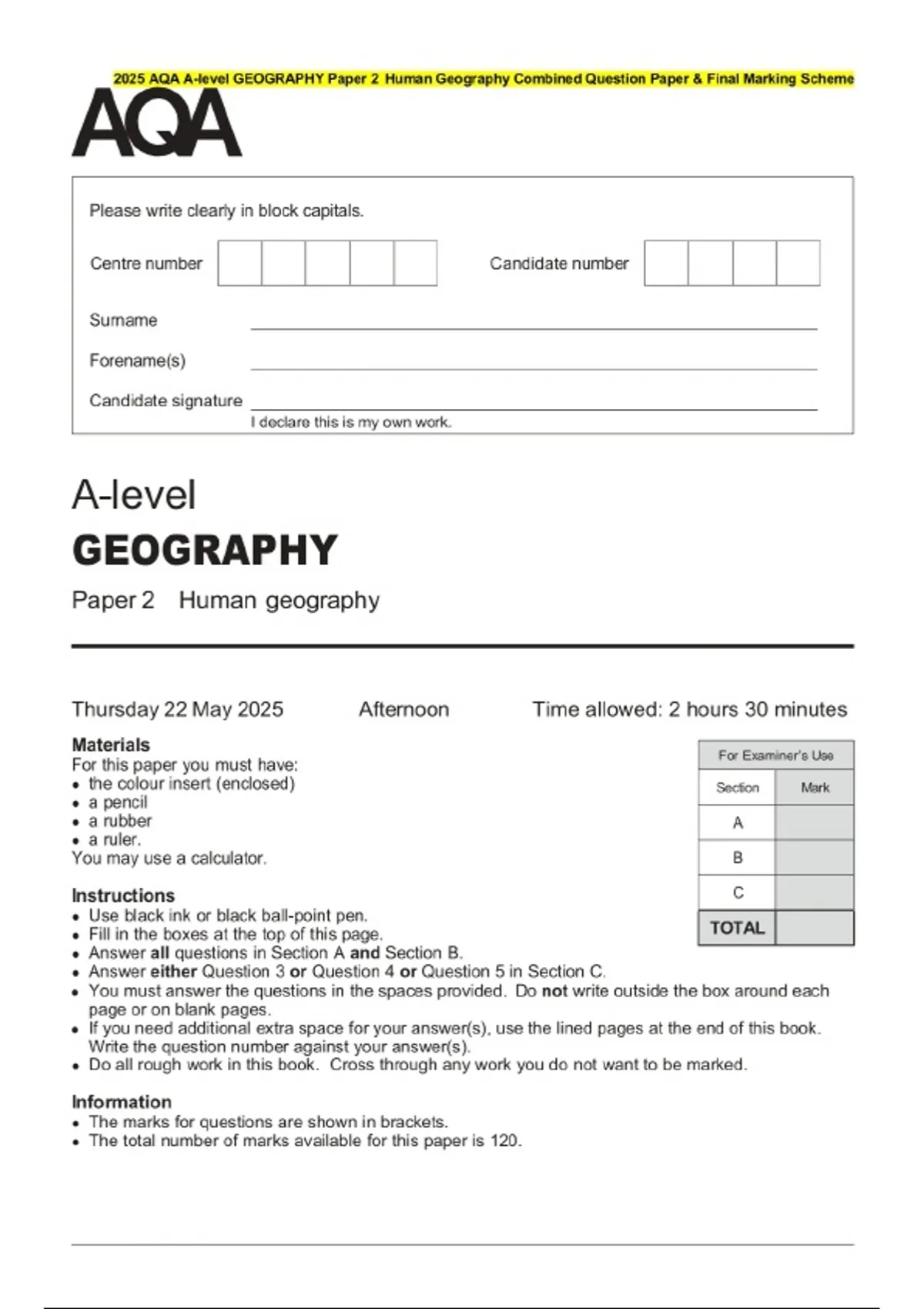 2025 AQA A-level GEOGRAPHY Paper 2 Human Geography Combined Question Paper & Final Marking Scheme