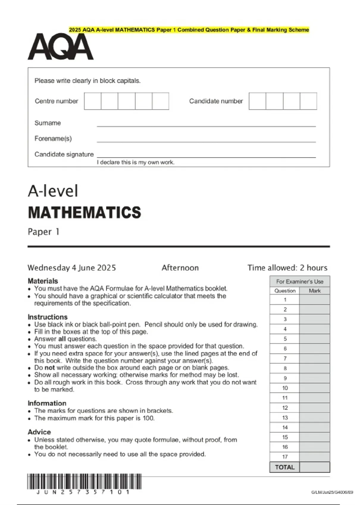 2025 AQA A-level MATHEMATICS Paper 1 Combined Question Paper & Final Marking Scheme