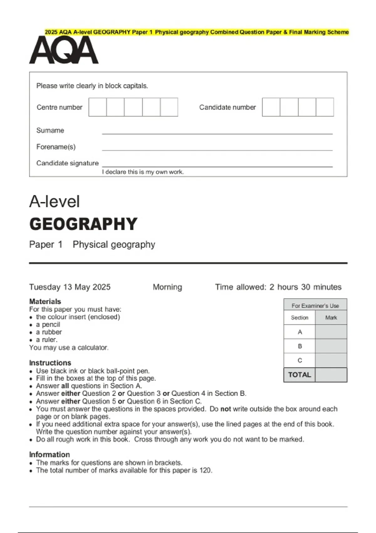 2025 AQA A-level GEOGRAPHY Paper 1 Physical geography Combined Question Paper & Final Marking Scheme