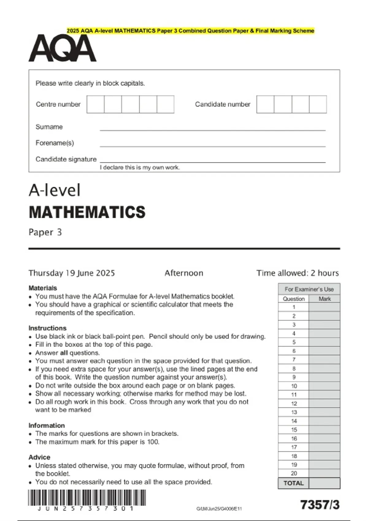 2025 AQA A-level MATHEMATICS Paper 3 Combined Question Paper & Final Marking Scheme