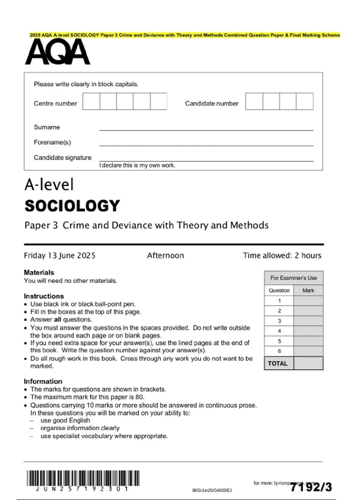 2025 AQA A-level SOCIOLOGY Paper 3 Crime and Deviance with Theory and Methods Combined Question Paper & Final Marking Scheme