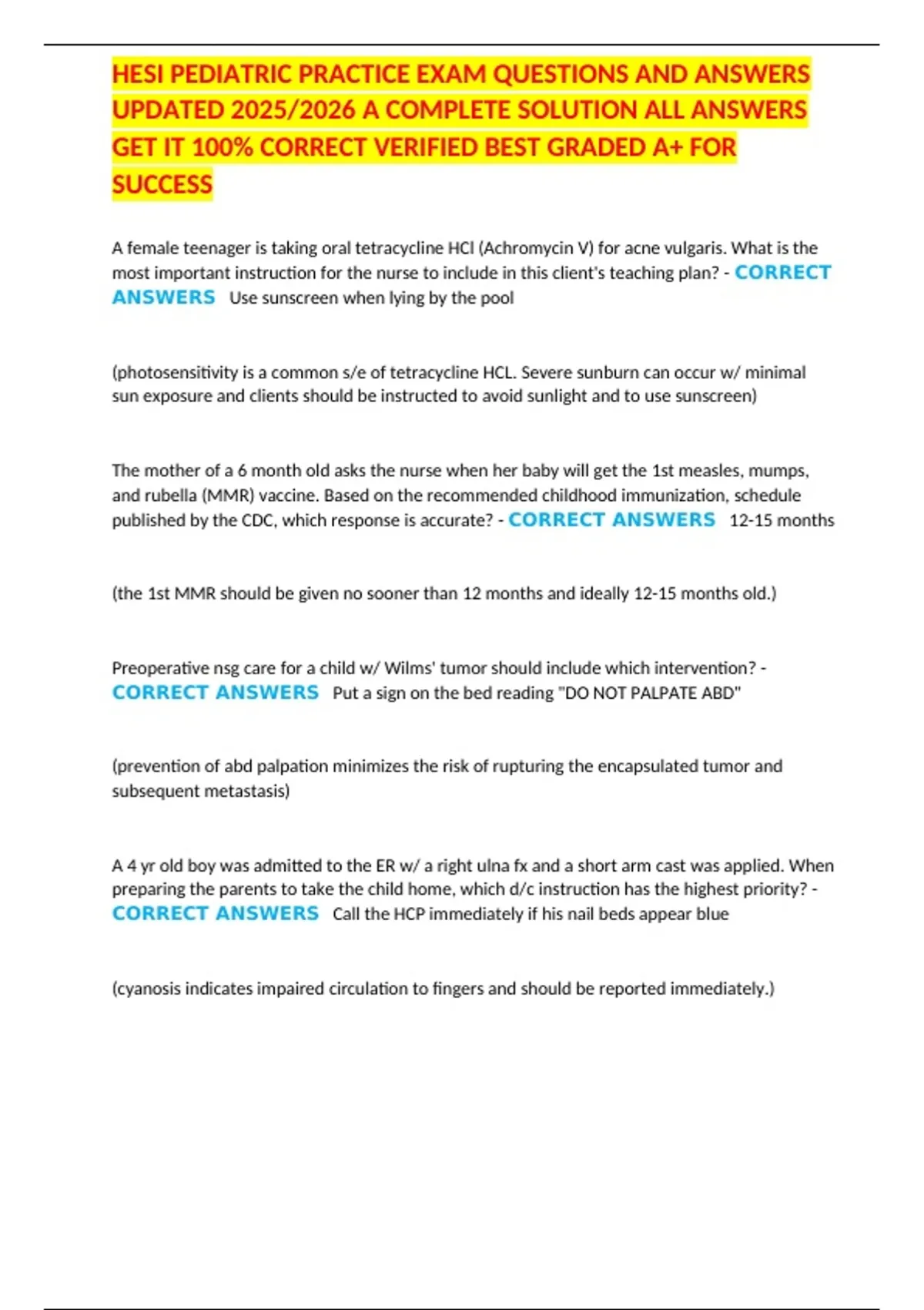 ,HESI PEDIATRIC PRACTICE EXAM QUESTIONS AND ANSWERS