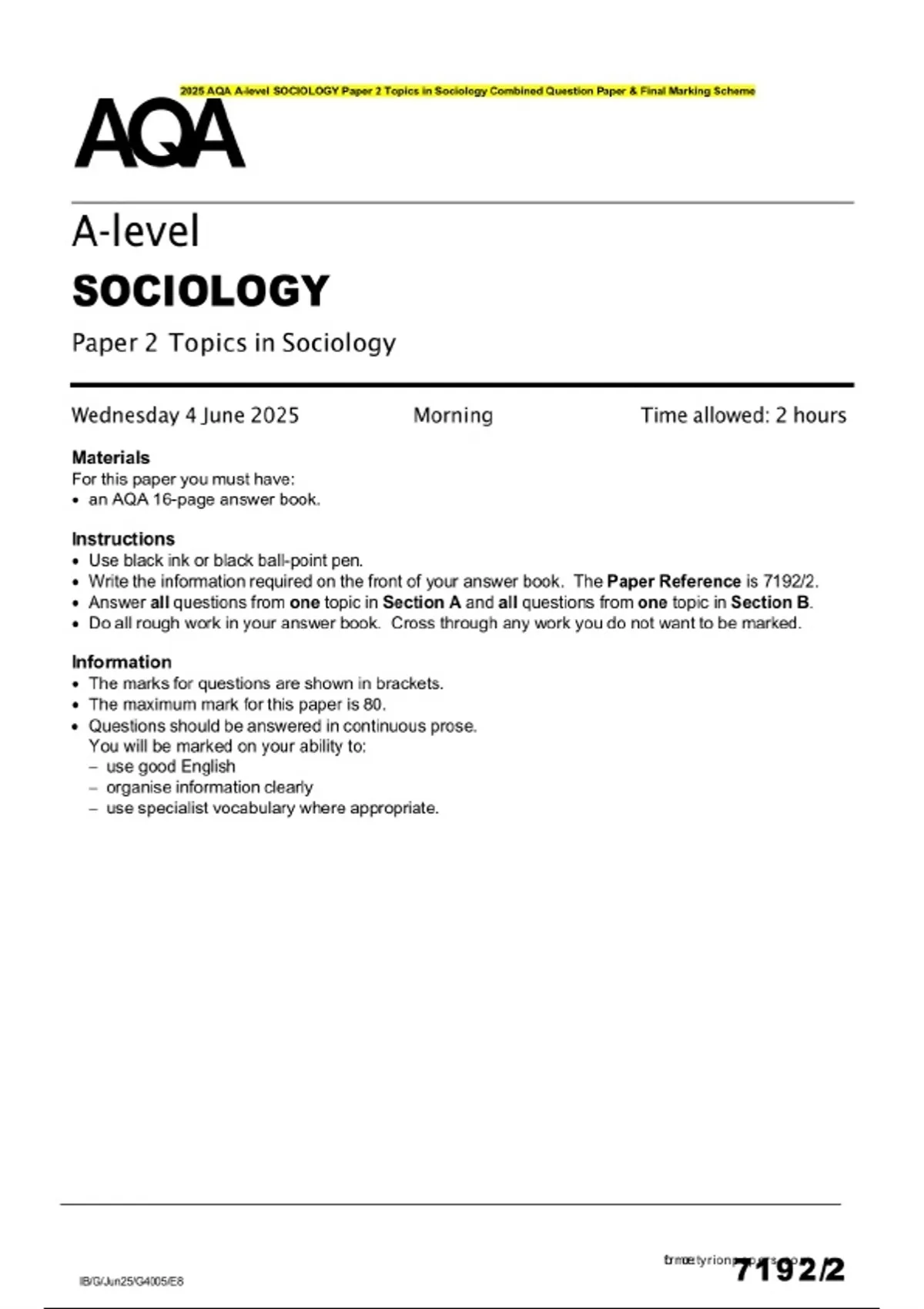 2025 AQA A-level SOCIOLOGY Paper 2 Topics in Sociology Combined Question Paper & Final Marking Scheme