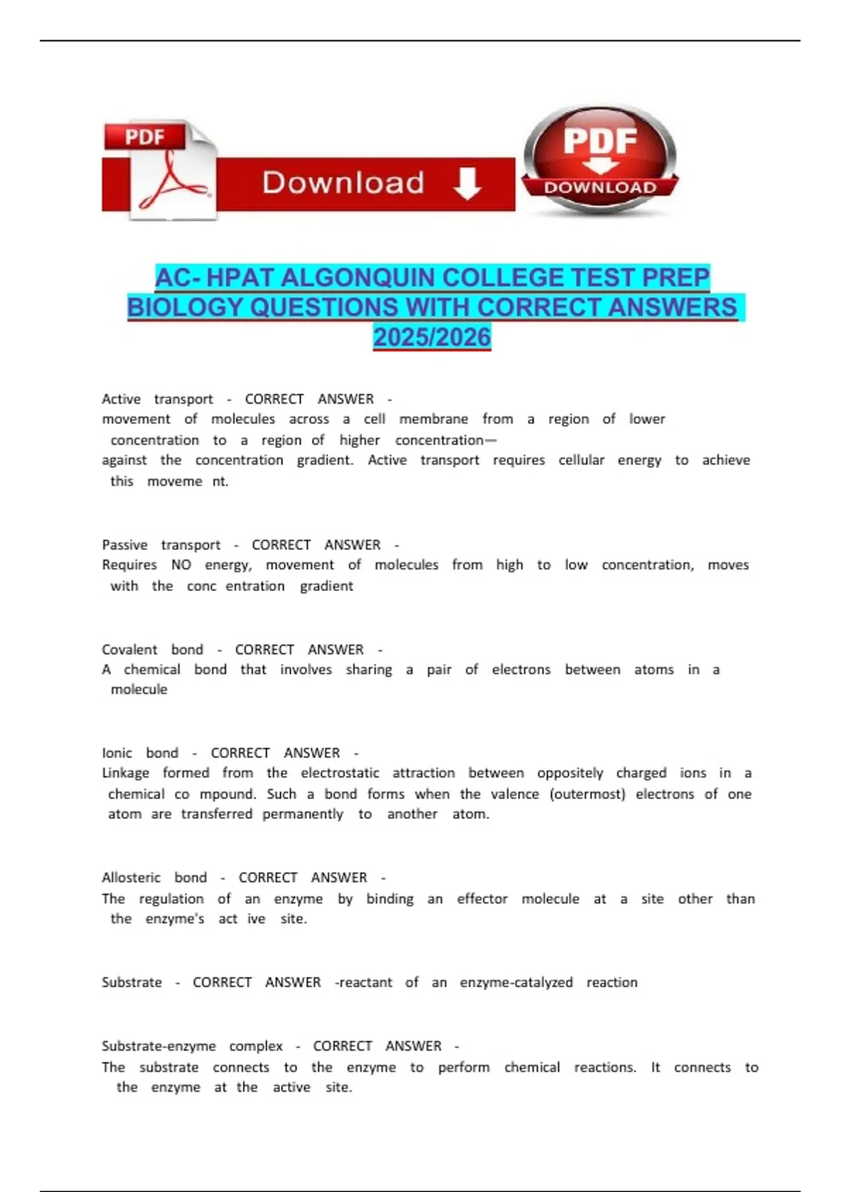 AC- HPAT ALGONQUIN COLLEGE TEST PREP BIOLOGY QUESTIONS WITH CORRECT ANSWERS