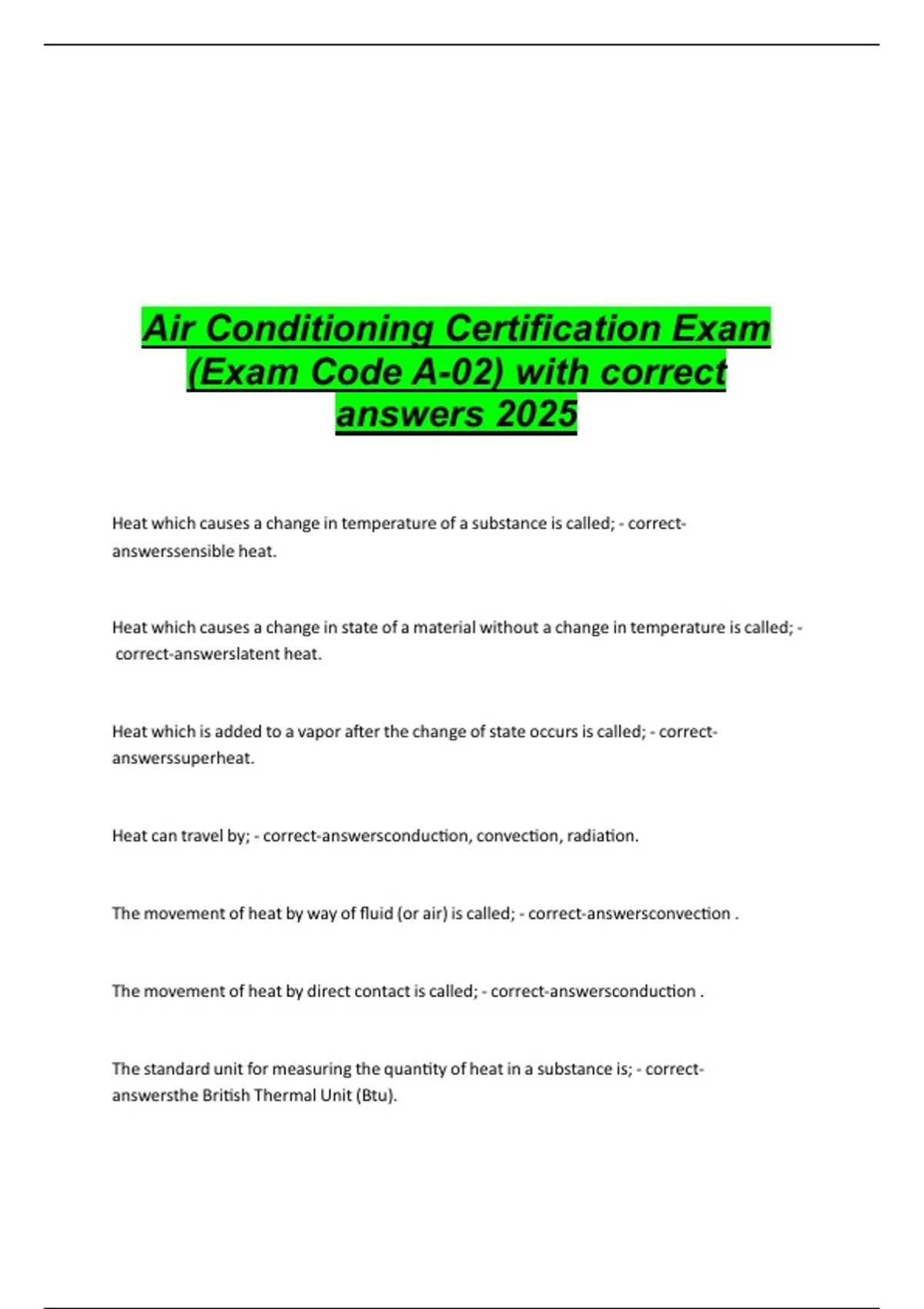 Complete study guide for Air Conditioning Certification Exam A-02. Covers HVAC principles, refrigerant handling, system troubleshooting, component functions, and EPA compliance with verified 2025 answers.