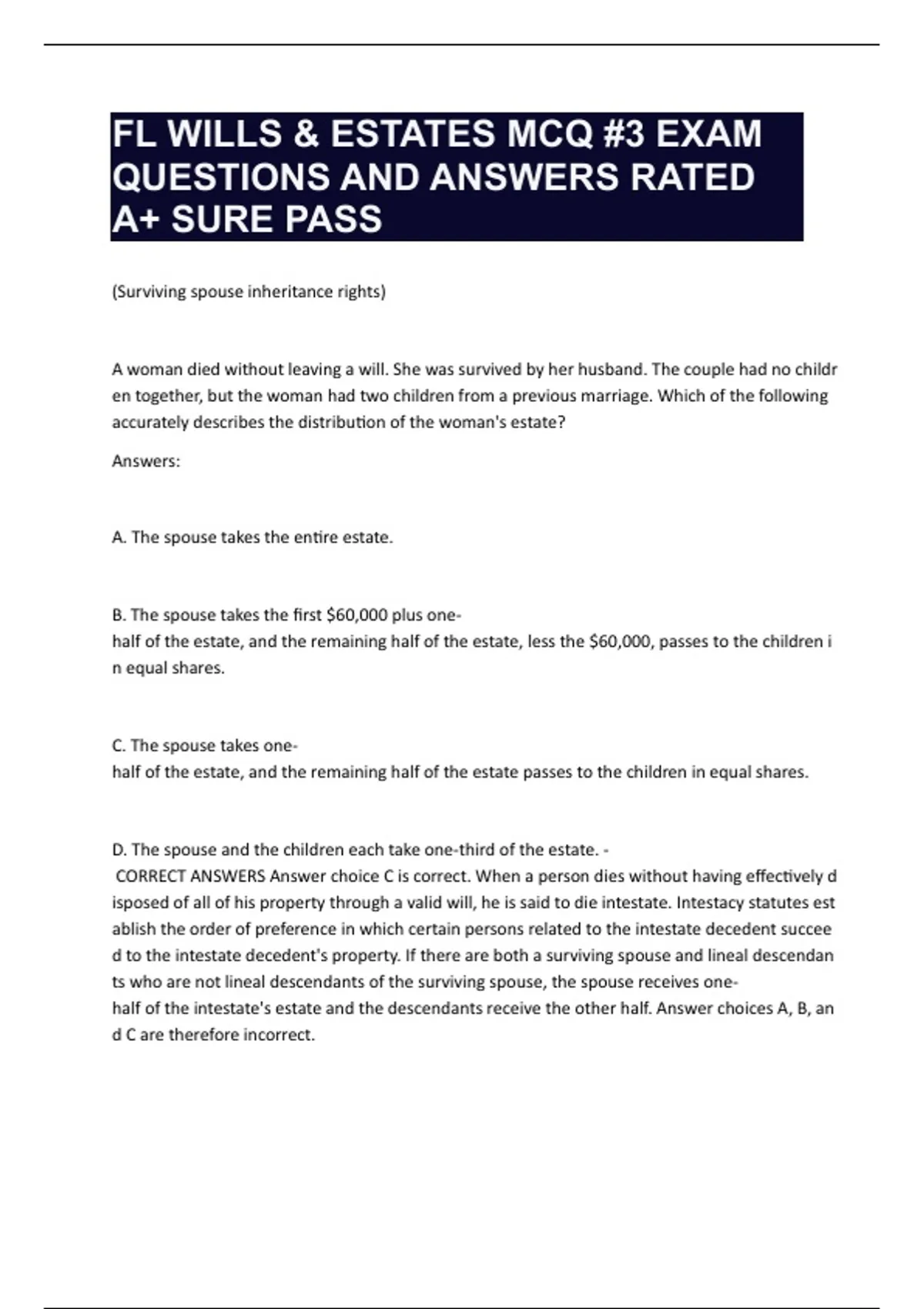 FL WILLS & ESTATES MCQ #3 EXAM QUESTIONS AND ANSWERS RATED A+ SURE PASS