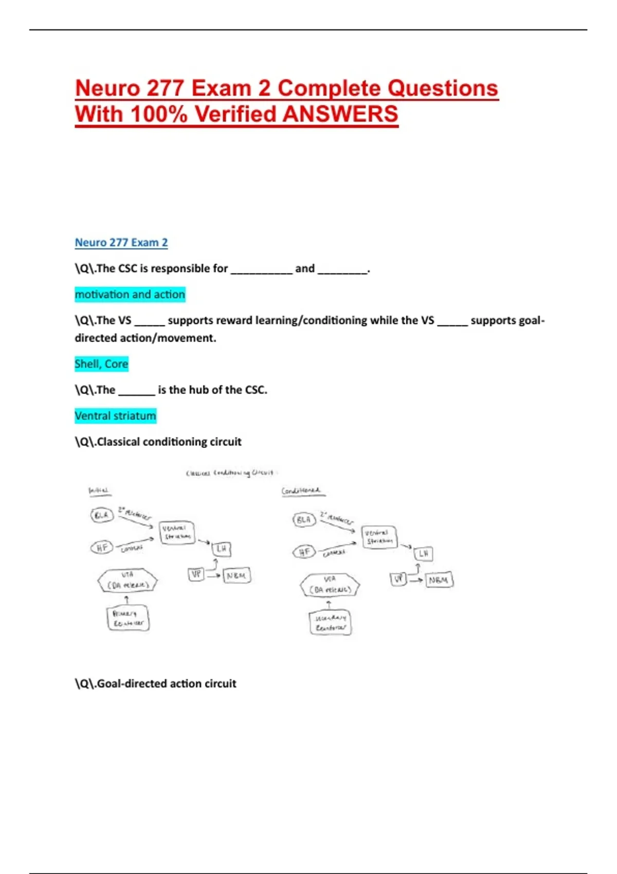 Neuro 277 Exam 2 Complete Questions With 100% Verified ANSWERS || Verified Exam Questions Neuro 277 Exam 2 Q.The CSC is responsible for __________ and ________. motivation and action Q.The VS _____ supports reward learning/conditioning while the VS _____ supports goal-directed action/movement. Shell, Core Q.The ______ is the hub of the CSC. Ventral striatum Q.Classical conditioning circuit Q.Goal-directed action circuit Q.The ____ provides context related to our experiences and allow us to learn about the context in which a specific motivation was satisfied. HF Q.3 type of VP neurons. - GABAergic - Opiodergic - Cholinergic Q.Action monitoring pathways Q.DS consists of: caudate and putamen Q.DP and DS collectively form the _______ Basal ganglia Q.SN of the midbrain projects mainly to the ___ and ___, whereas the VTA of the midbrain projects mainly to the ______ and ______. - DS and DP - VS and PFC Q.Opioid signaling is responsible for the experience of _______ whereas dopamine signaling is involved in experiences of ______ and _______. - Pleasure - Wanting and learning Q.Hedonic hotspots VS, VP, PBN Q.When the reward was withheld from the monkey after it learned that a cue predicted the reward, there was a _____ in DA signaling at the time the reward would normally occur. Decrease Q.Successful goal-directed plan Q._____ conditioning requires a behavioral response to a cue in order to receive a reward, whereas ______ conditioning does not. - Operant - Classical