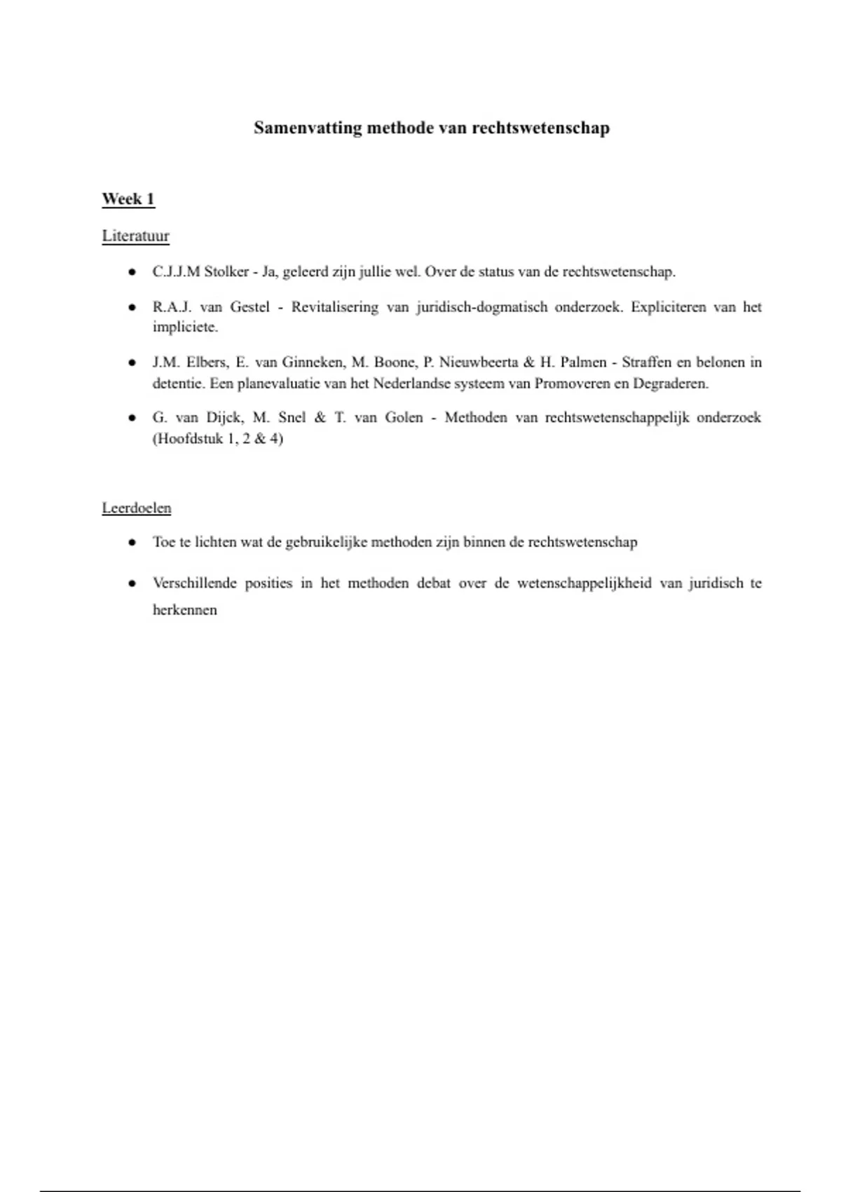 Deze samenvatting is bedoeld voor het vak Methode van de Rechtswetenschap en verwerkt alle behandelde stof van week 1 tot en met week 6. De samenvatting telt 118 pagina’s en zet de verschillende standpunten en meningen van de besproken auteurs helder uiteen. Rood is belangrijke kern tekst. Paars zijn de auteurs die in een tekst worden besproken. Blauw zijn voorbeelden die worden aangehaald. Per tekst wordt eerst kort de kern weergegeven, gevolgd door een meer uitgebreide samenvatting. Hierdoor krijg je snel inzicht in de hoofdgedachten, met daarnaast voldoende verdieping. Door deze opzet is de samenvatting een overzichtelijke en effectieve voorbereiding op het tentamen.