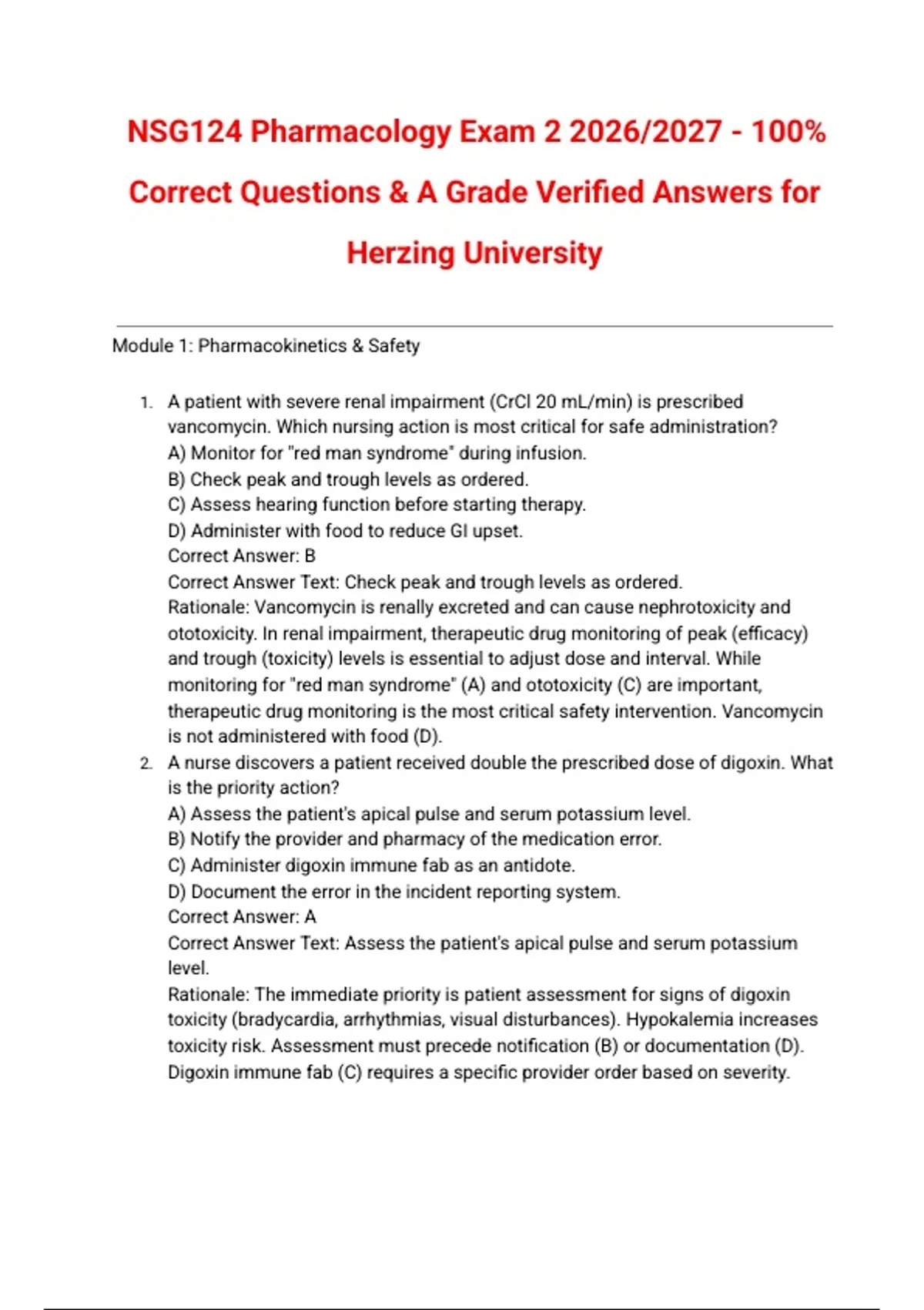 NSG124 Pharmacology Exam 2 2026/2027 - 100% Correct Questions & A Grade Verified Answers for Herzing University