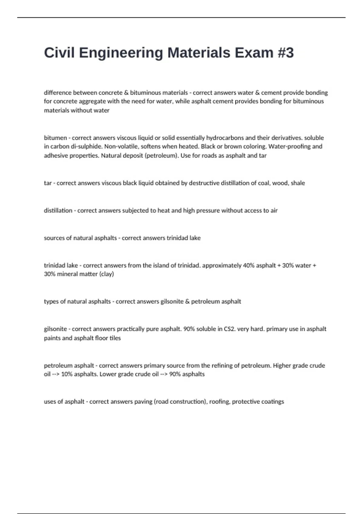 gilsonite - correct answers practically pure asphalt. 90% soluble in CS2. very hard. primary use in asphalt