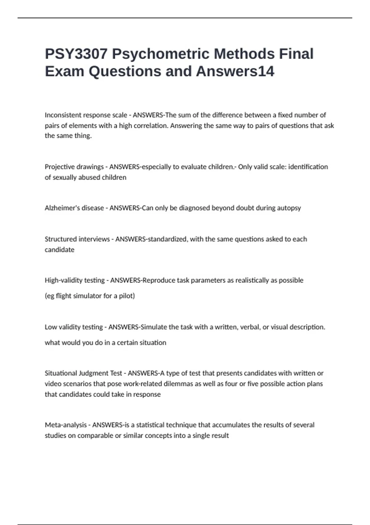 PSY3307 Psychometric Methods Final Exam Questions and Answers
