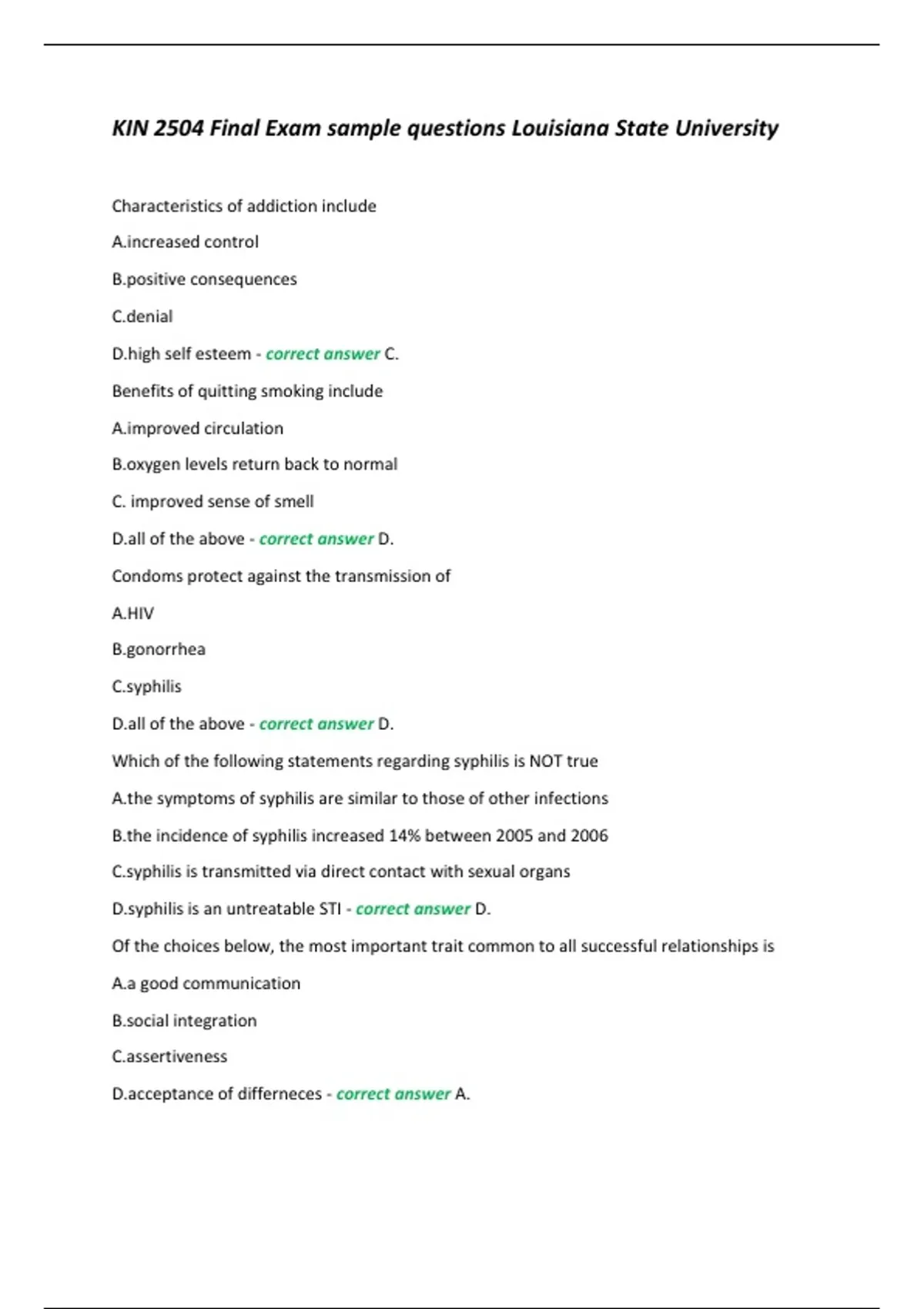 Characteristics of addiction include A.increased control B.positive consequences C.denial D.high self esteem - correct answer C. Benefits of quitting smoking include A.improved circulation B.oxygen levels return back to normal C. improved sense of smell D.all of the above - correct answer D. Condoms protect against the transmission of A.HIV B.gonorrhea C.syphilis D.all of the above - correct answer D. Which of the following statements regarding syphilis is NOT true A.the symptoms of syphilis are similar to those of other infections B.the incidence of syphilis increased 14% between 2005 and 2006 C.syphilis is transmitted via direct contact with sexual organs D.syphilis is an untreatable STI - correct answer D. Of the choices below, the most important