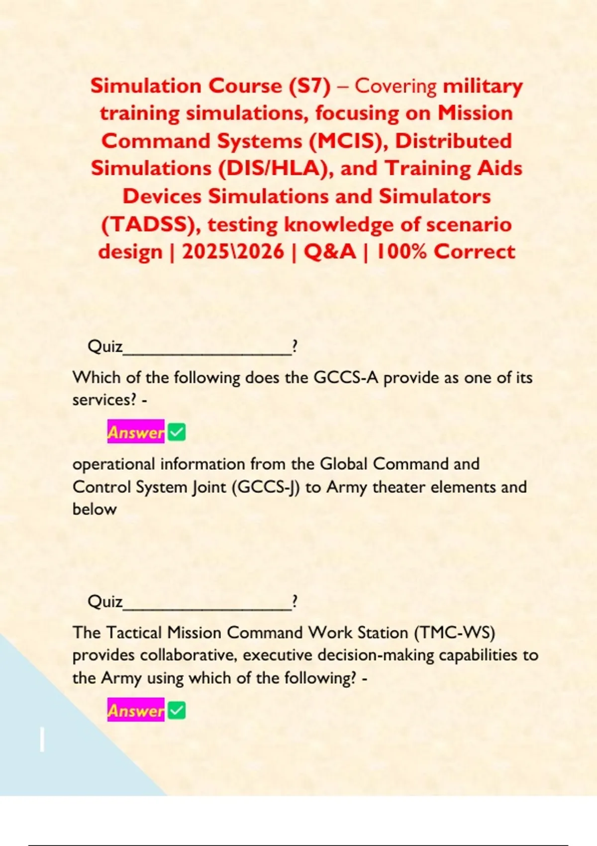 Simulation Course (S7) – Covering military training simulations, focusing on Mission Command Systems (MCIS), Distributed Simulations (DIS/HLA), and Training Aids Devices Simulations and Simulators (TADSS), testing knowledge of scenario design | | Q&A | 100% Correct Quiz_________________? Which of the following does the GCCS-A provide as one of its services? - Answer operational information from the Global Command and Control System Joint (GCCS-J) to Army theater elements and below Quiz_________________? The Tactical Mission Command Work Station (TMC-WS) provides collaborative, executive decision-making capabilities to the Army using which of the following? - Answer Common Operational Picture (COP) management Quiz_________________? Currently enemy forces have been detected, and are approaching your brigades sector. You must quickly locate the enemy before formulating an offensive or defensive strategy for the impending contact with the opposing force. You are in need of a system that specifically acquires data from the Army, joint, national, and allied sensors and sources to provide intelligence on the battlefield across multiple security levels. Which of the following systems would prove most helpful in this situation? - Answer Distributed Common Ground System-Army (DCGS-A) Quiz_________________? A Soldier is about to be deployed to a classified location. After the Soldiers are transported via aircraft, they will have to travel along a small, dangerous road that is close to enemy lines. This particular road is notorious for hosting improvised explosive devices (IEDs). Which system should be used to monitor the road as the Soldiers make their way to the specified location? - Answer Combined Information Data Network Exchange (CIDNE) Quiz_________________? Your commanding officer notices that a minor miscommunication may have been made between two different mission command information systems. You are tasked with ensuring that successful communication between different MCIS is made from now on through the provision of a stand-alone network for both the Secure Internet Protocol Router (SIPR) and Non-Classified Internet Protocol Router (NIPR). Which of the following networks will prove most helpful to you when carrying out this order? - Answer Warfighter Information Network-Tactical (WIN-T)