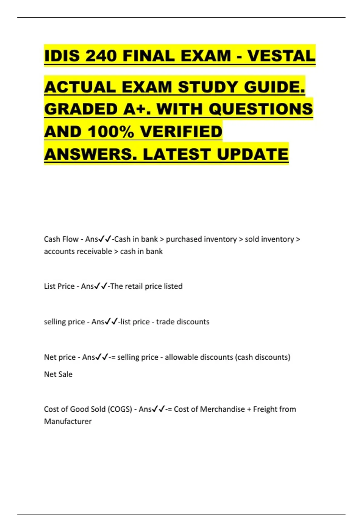 IDIS 240 FINAL EXAM - VESTAL ACTUAL EXAM STUDY GUIDE. GRADED A+. WITH QUESTIONS AND 100% VERIFIED ANSWERS. LATEST UPDATE IDIS 240 FINAL EXAM - VESTAL ACTUAL EXAM STUDY GUIDE. GRADED A+. WITH QUESTIONS AND 100% VERIFIED ANSWERS. LATEST UPDATE