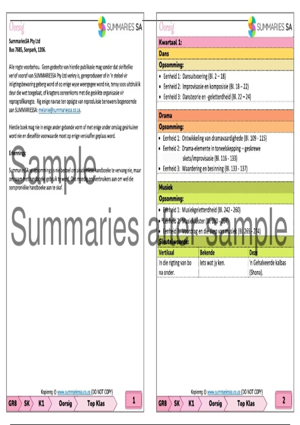 Hierdie produk bevat die Kwartaal 1 opsommings van die Top Klas handboek vir Graad 8. Dans:  Eenheid 1 tot 3 – Dansuitvoering | Improvisasie en komposisie | Dansteorie en dansgeletterdheid Drama:  Eenheid 1 tot 3 – Ontwikkeling van dramavaardighede | Drama-elemente in toneelskepping – geskrewe | Waardering en besinning Musiek:  Eenheid 1 en 3 – Musiekgeletterdheid | Musiekluister | Voordrag en die skep van musiek Visuele kuns:  Eenheid 1 tot 5 – Visuele geletterdheid: Kuns as populêre kultuur en ontwerp | Skep in 2D: Ontwerp ’n strokiesprentboekomslag | Visuele geletterdheid: Kyk na houers | Skep in 3D: Erdeware houers | Skep in 3D: Mitologiese houers